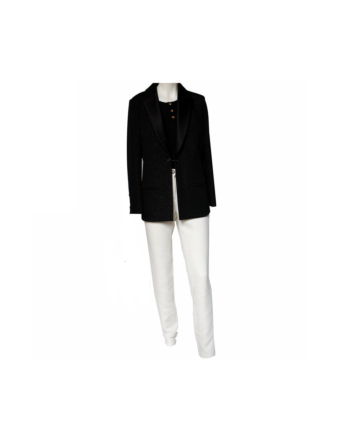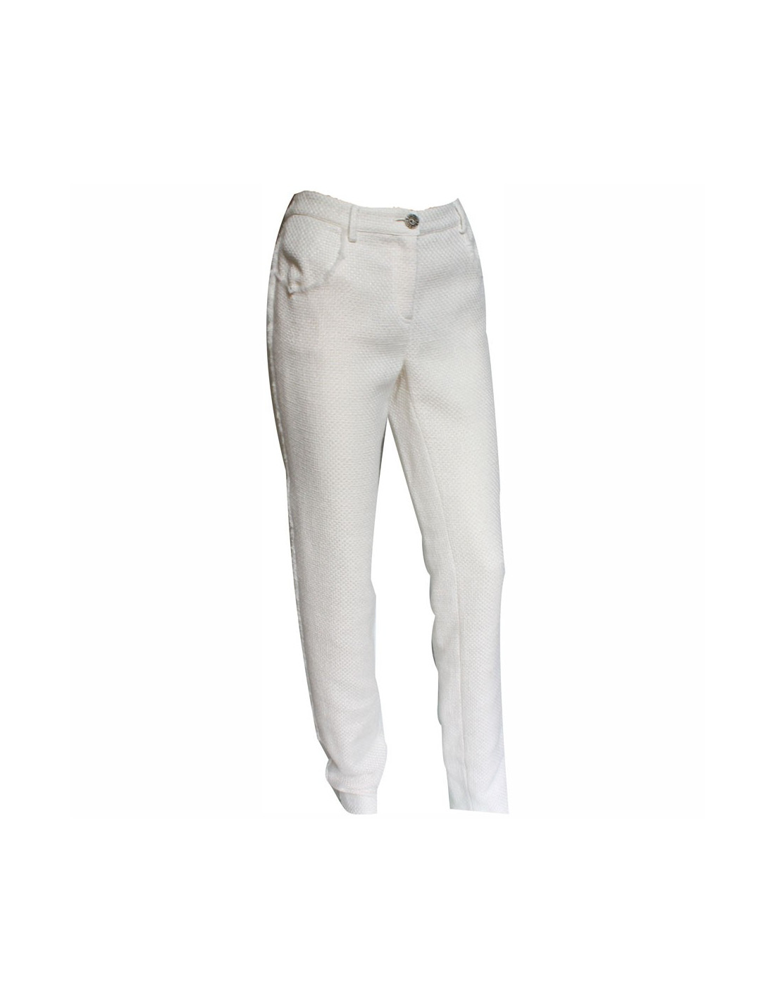 Sublime pants Chanel, tweed's white cotton size 40. It is fully lined with silk. There are two pockets in the front and two pockets on the back of the pants. An elegant short fringe is on the ends of the length. A stylish jewel CC silver button closes the pants. Impeccable condition, fate of Dyer.