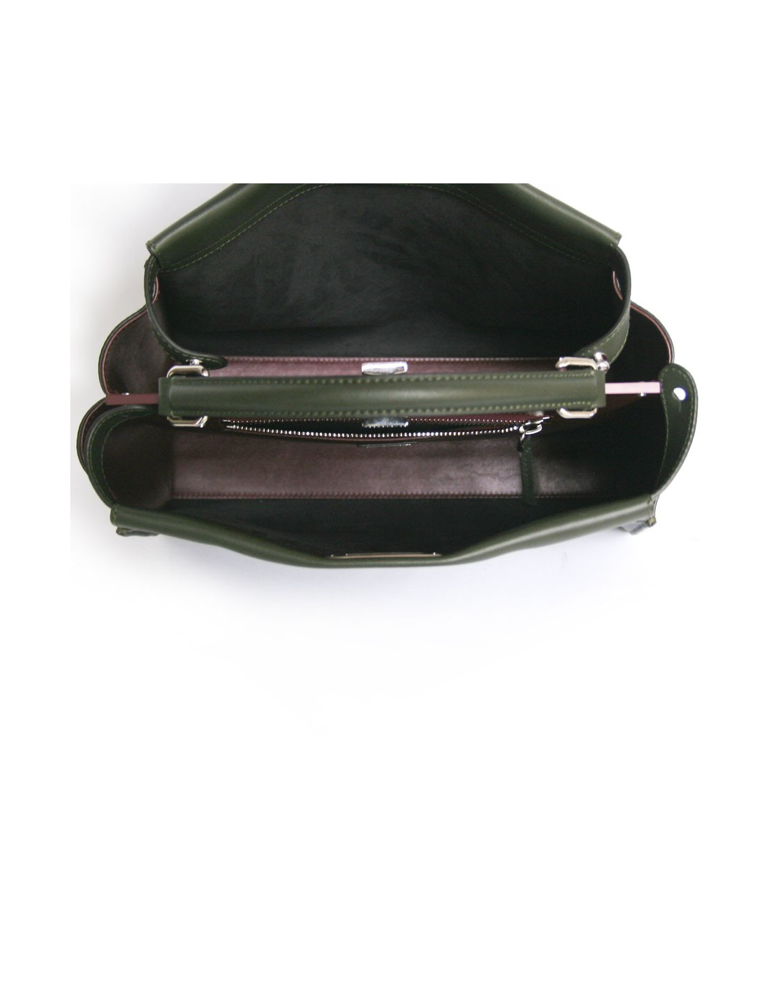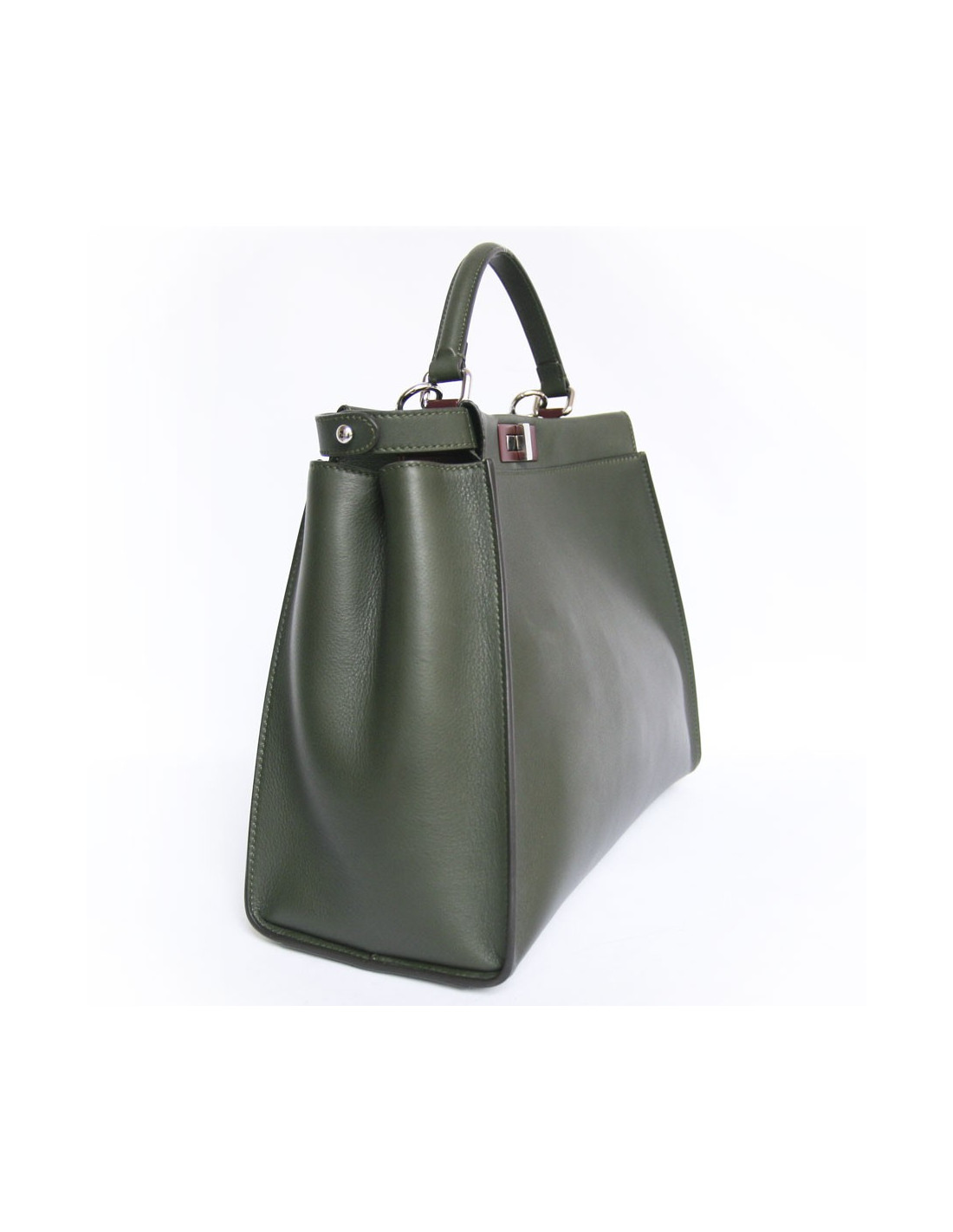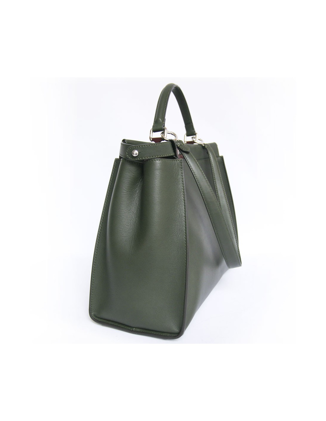 Bag Peekaboo House Fendi khaki green lamb leather. The hardware is silver metal. The Interior is in Navy Blue Suede and Burgundy leather. It has two compartments with a zippered pocket. He is handmade using a handle and also in the shoulder with a removable shoulder strap. It will be supplied with a bag of rain. In very good condition.