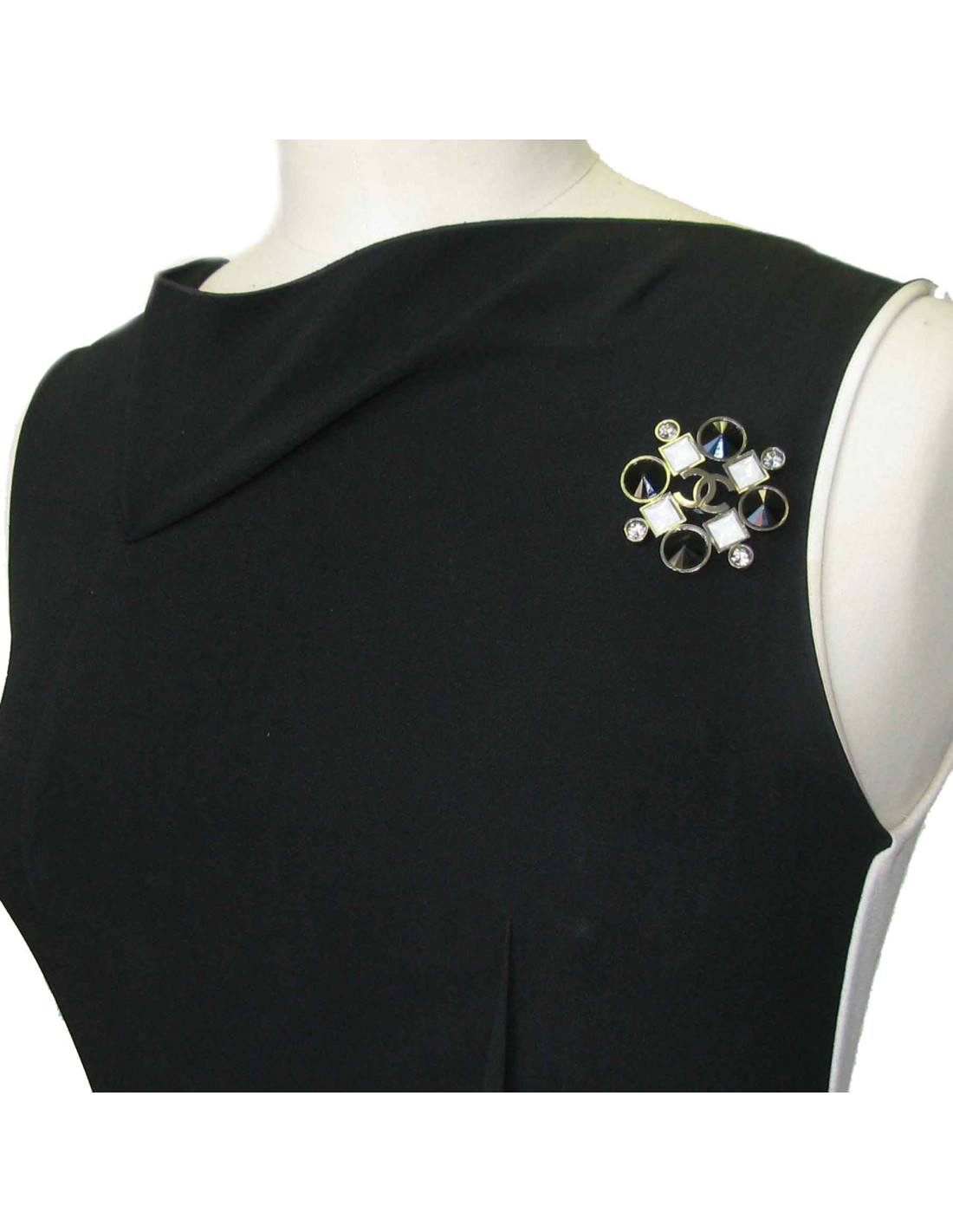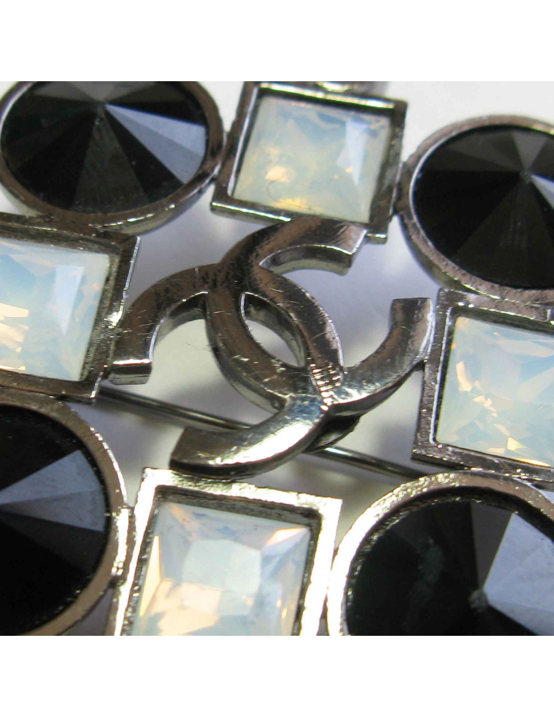 Broche Chanel en métal argenté serie de strass ronds et carrés. Couleur : noir, transparent et blanc. Un CC se trouve au centre de la broche.