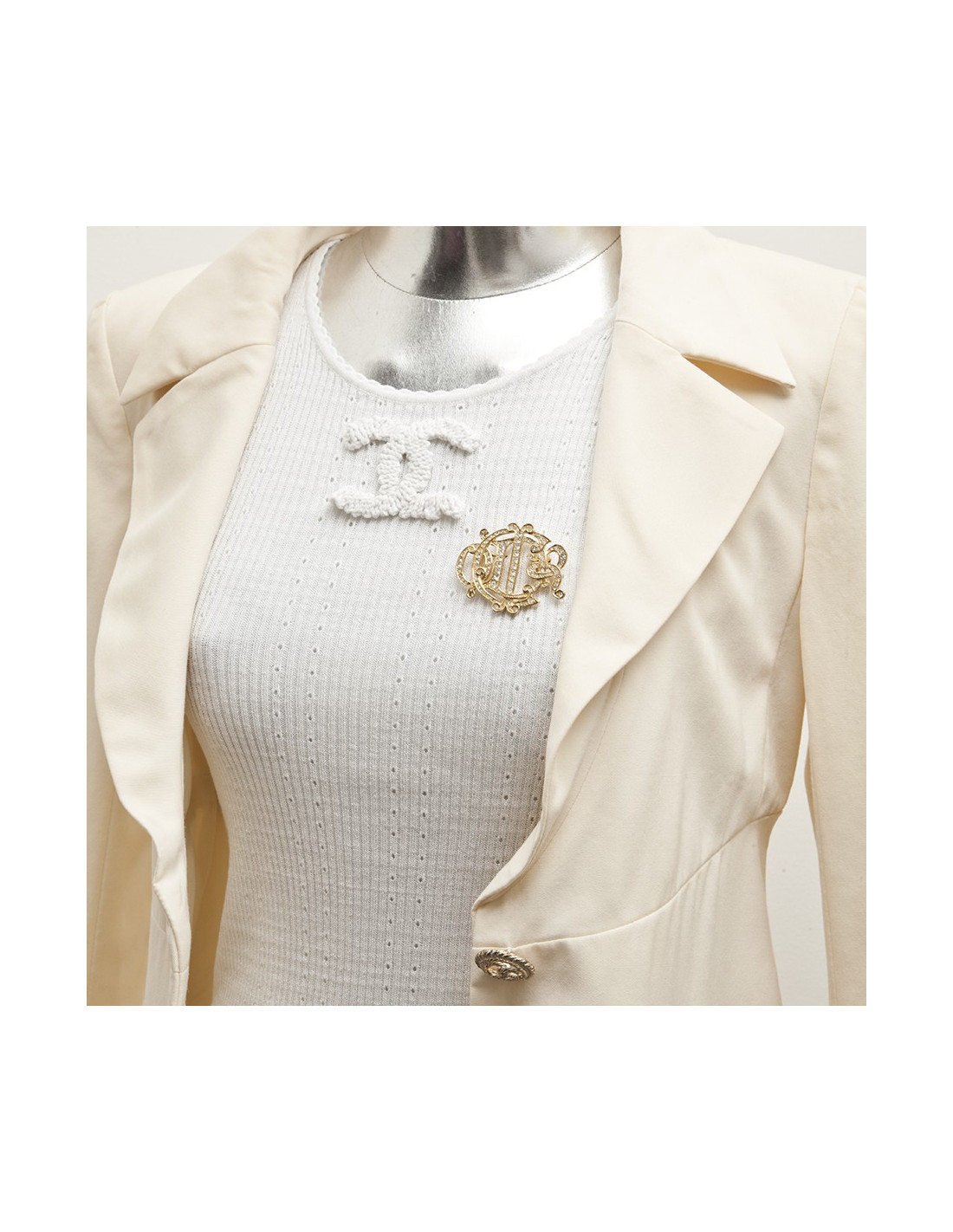 Last items in stock PINS-BROOCHES CHANEL CC Chain Brooch CHANEL 36144 550.00 € Chanel CC brooch in silver and white Condition : excellentMade in FranceMaterial : silver metal and resinColor : mat silver, whiteDimensions : 5 x 4 cmHardware : ruthenium silver metalStamp : yesYear : 2022Details : white resin intertwined with mat silver metal reminding of the iconic chain straps of Chanel bags. Delivered in a Valois Vintage Paris dustbag Add to cart