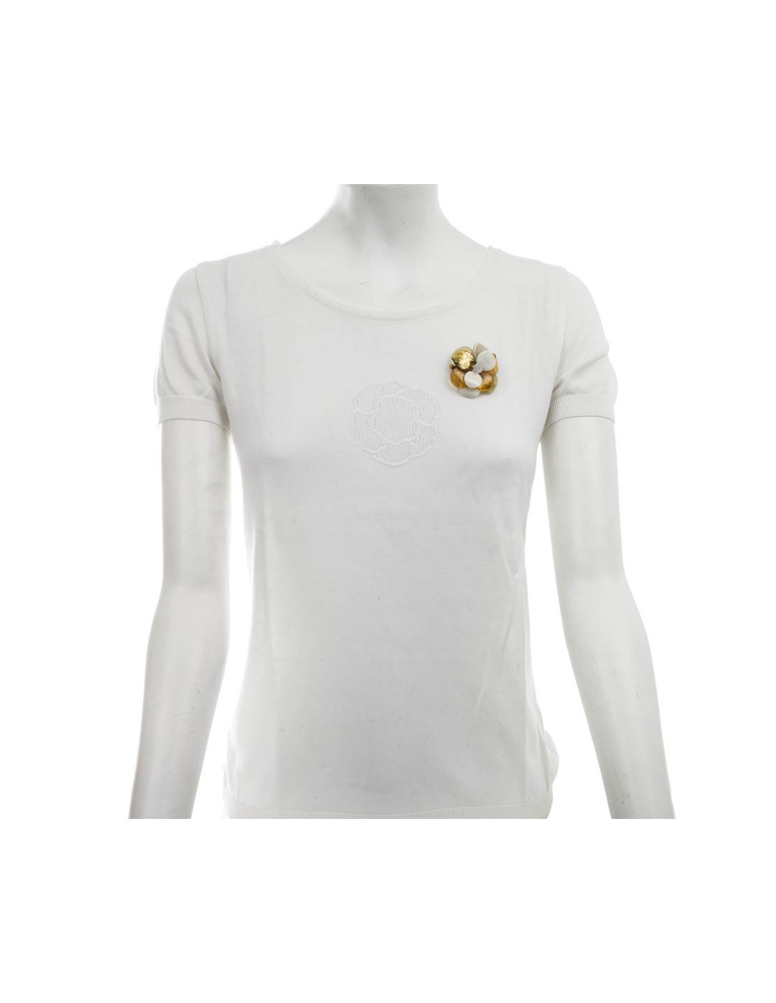Marguerite de Valois Couture Camellia brooch made of glass paste mounted on gold-plated metal. The petals are tricolor topaz, pale green and gradient beige heated with gold leaf.
