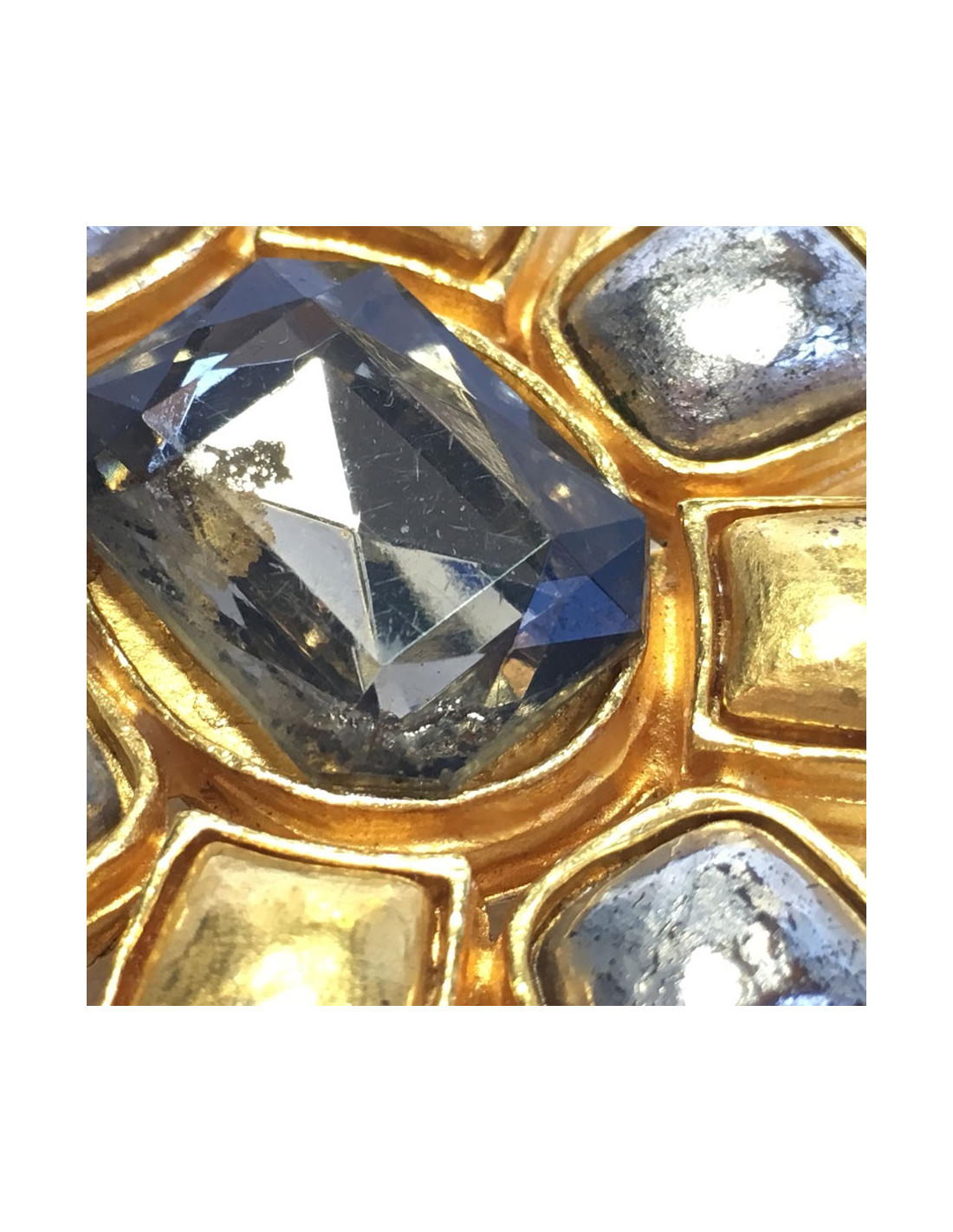 Vintage, Chanel brooch in gilded and silver metal. A transparent rhinestone is at the center of the jewel.