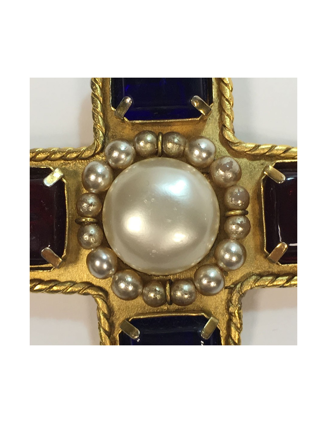 Chanel brooch in gold metal and sapphire blue and ruby molten glass and pearls (some traces on pearls, mother of pearl is removed in places: see photo).