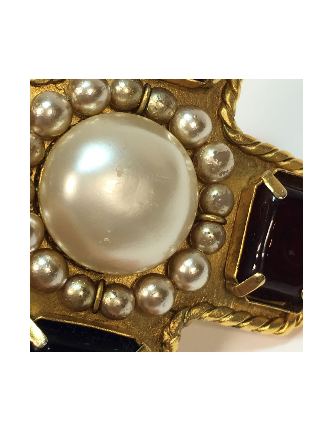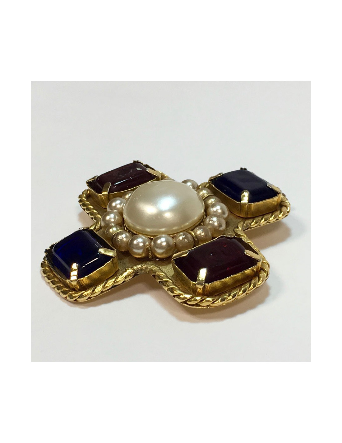 Chanel vintage brooch in gilt metal, colored molten glass and pearls