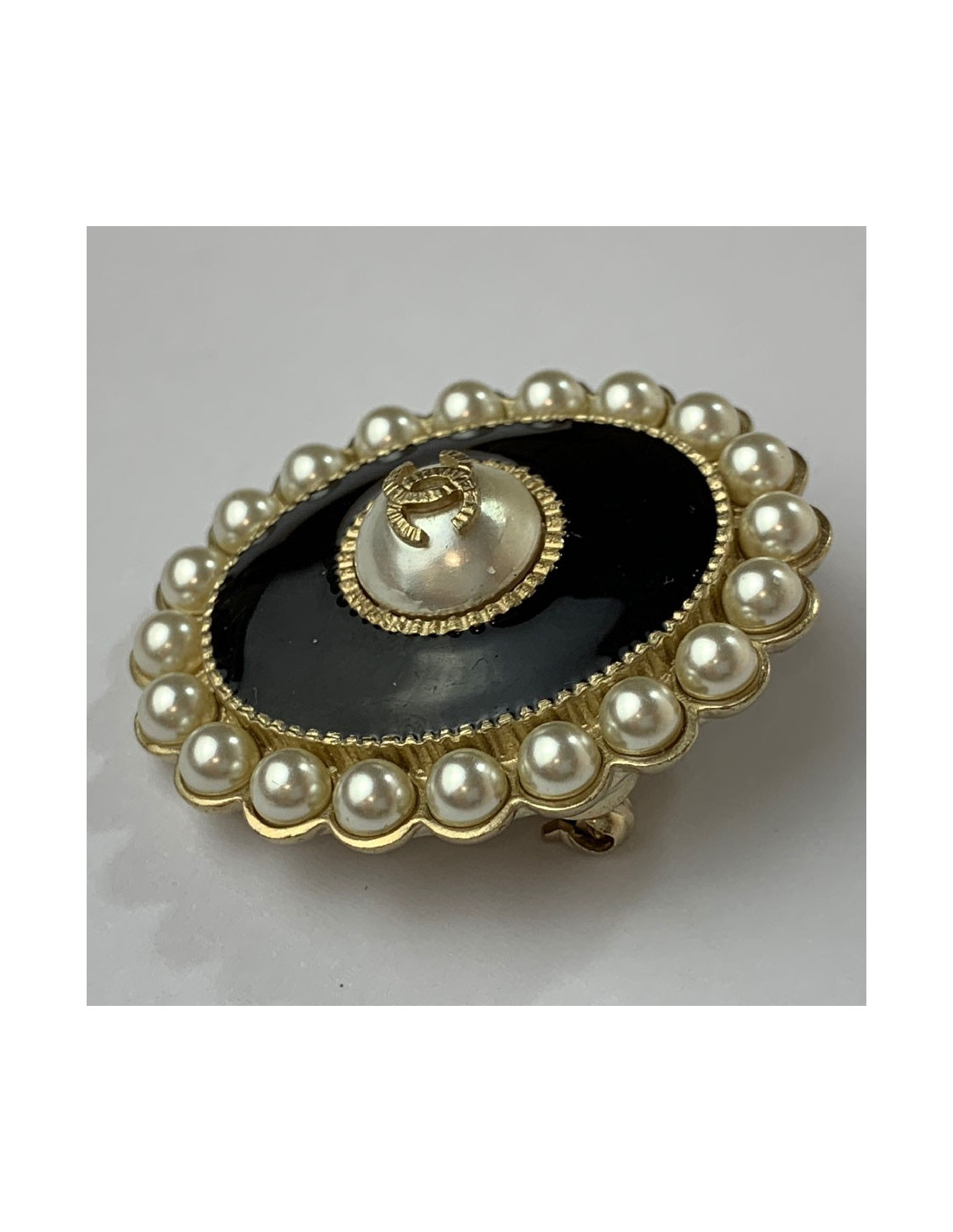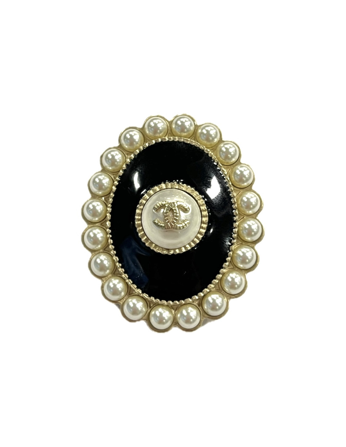 Details: oval brooch from the collection Croisière Paris Cuba 2017, in black resin, gold plated metal and is set with pearls all around. It has a pearl in its center with a golden CC logo