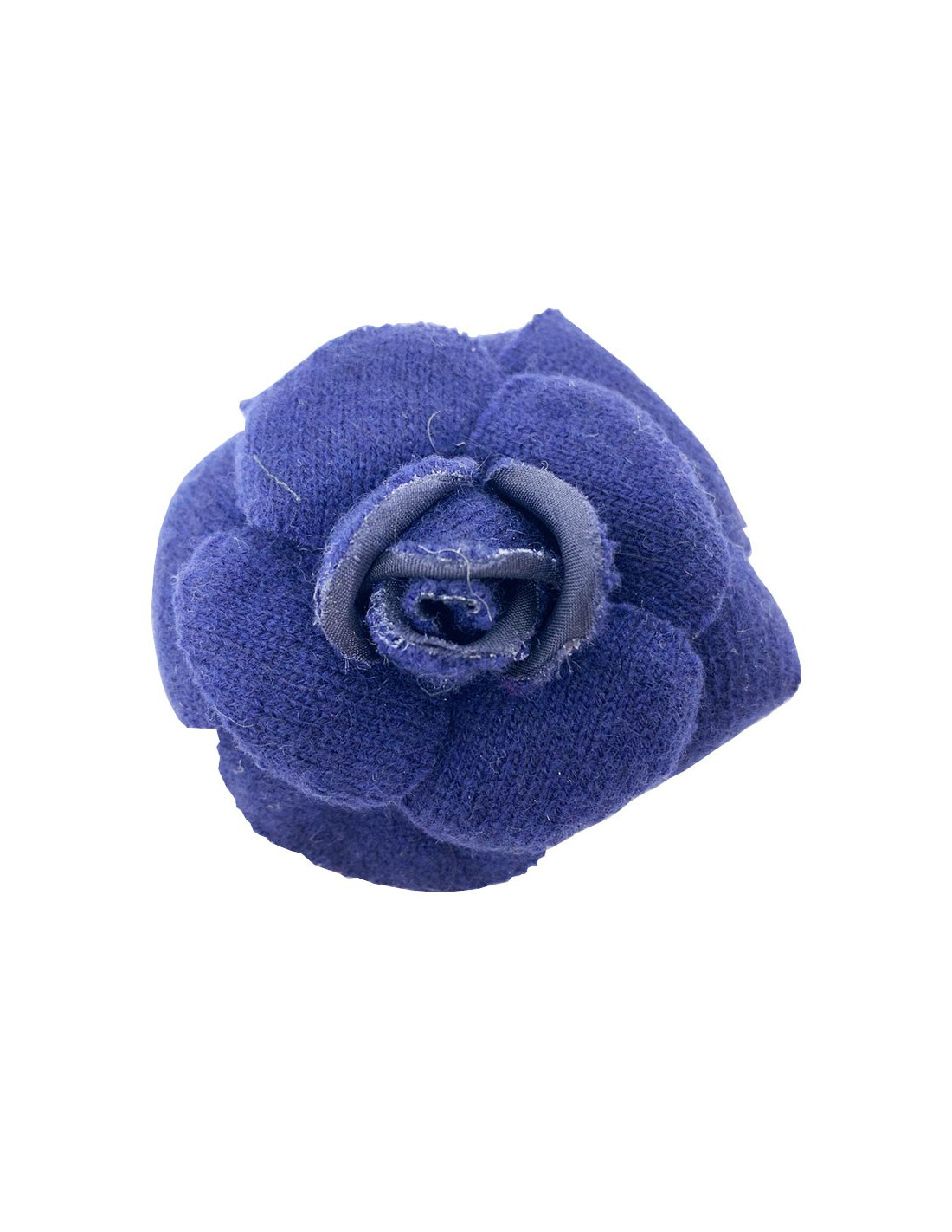Iconic brooch from CHANEL, this camellia brooch is in blue wool knit. The brand stamp is on the back of the brooch. Made in France.