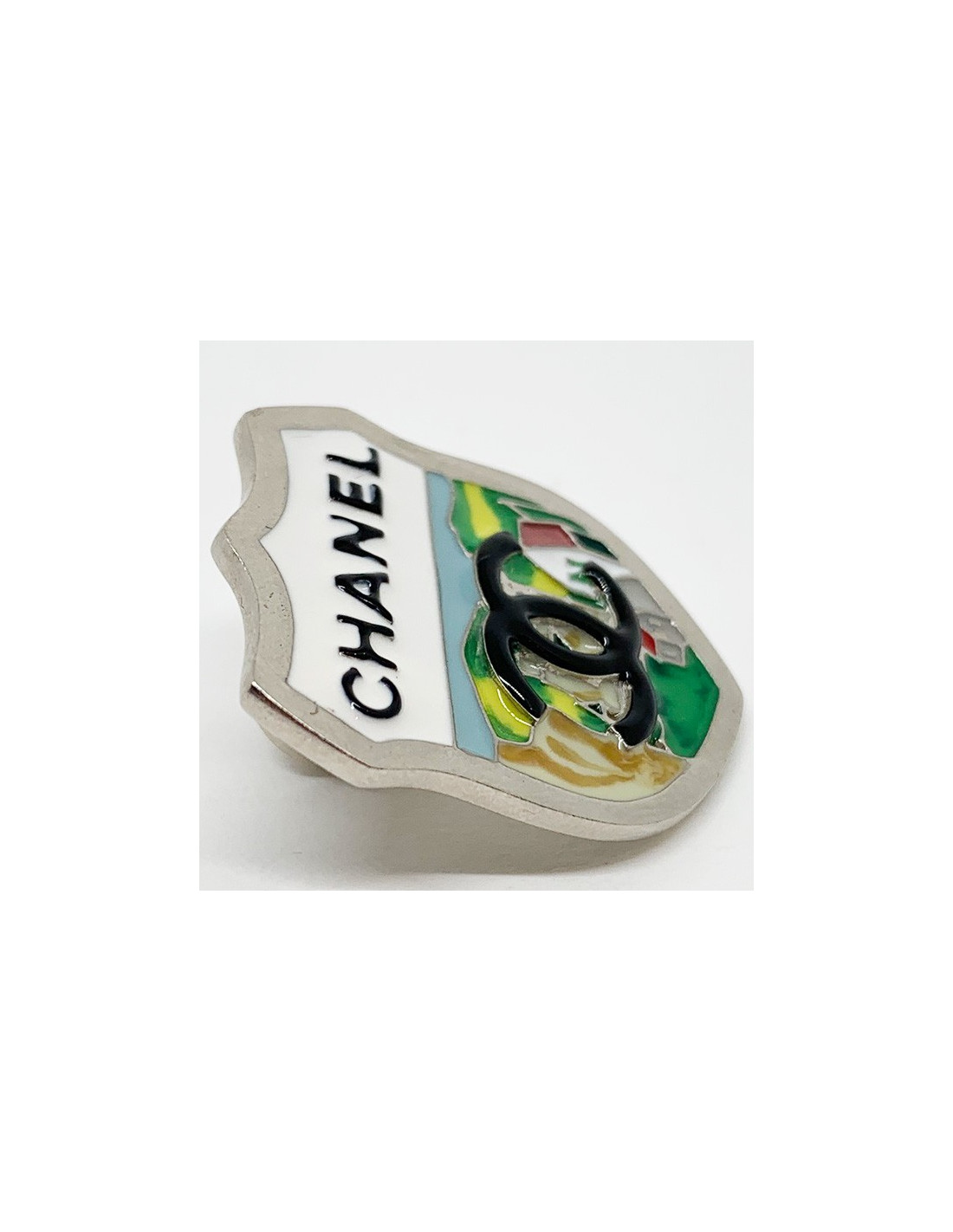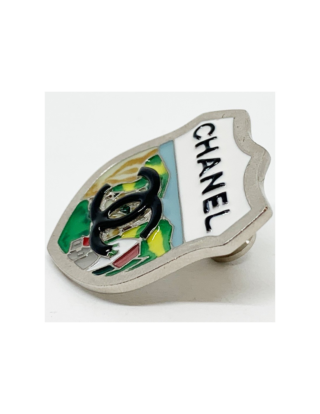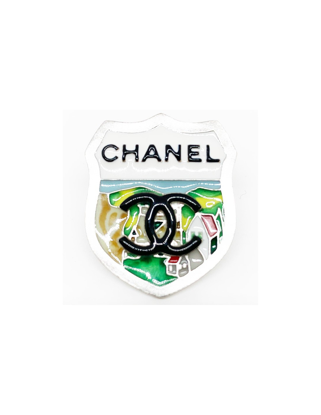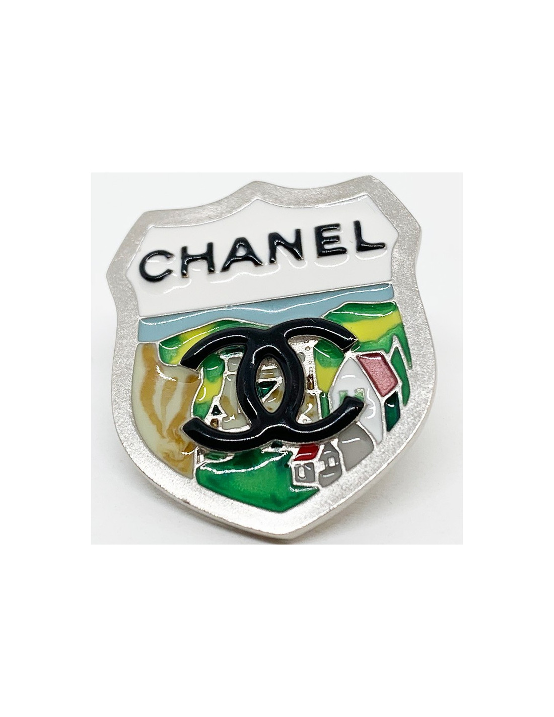 This Chanel pin is an attractive little accessory. It comes from the Autumn 2015 collection. Its blazon shape represents a picturesque landscape composed of a village. On top is the famous double C, as well as the name CHANEL. This pin will embellish your sweaters, jacket lapels, handbags and t-shirts. You can wear it on its own, or combine it with other CHANEL brooches, a pearl necklace or even a chain belt.