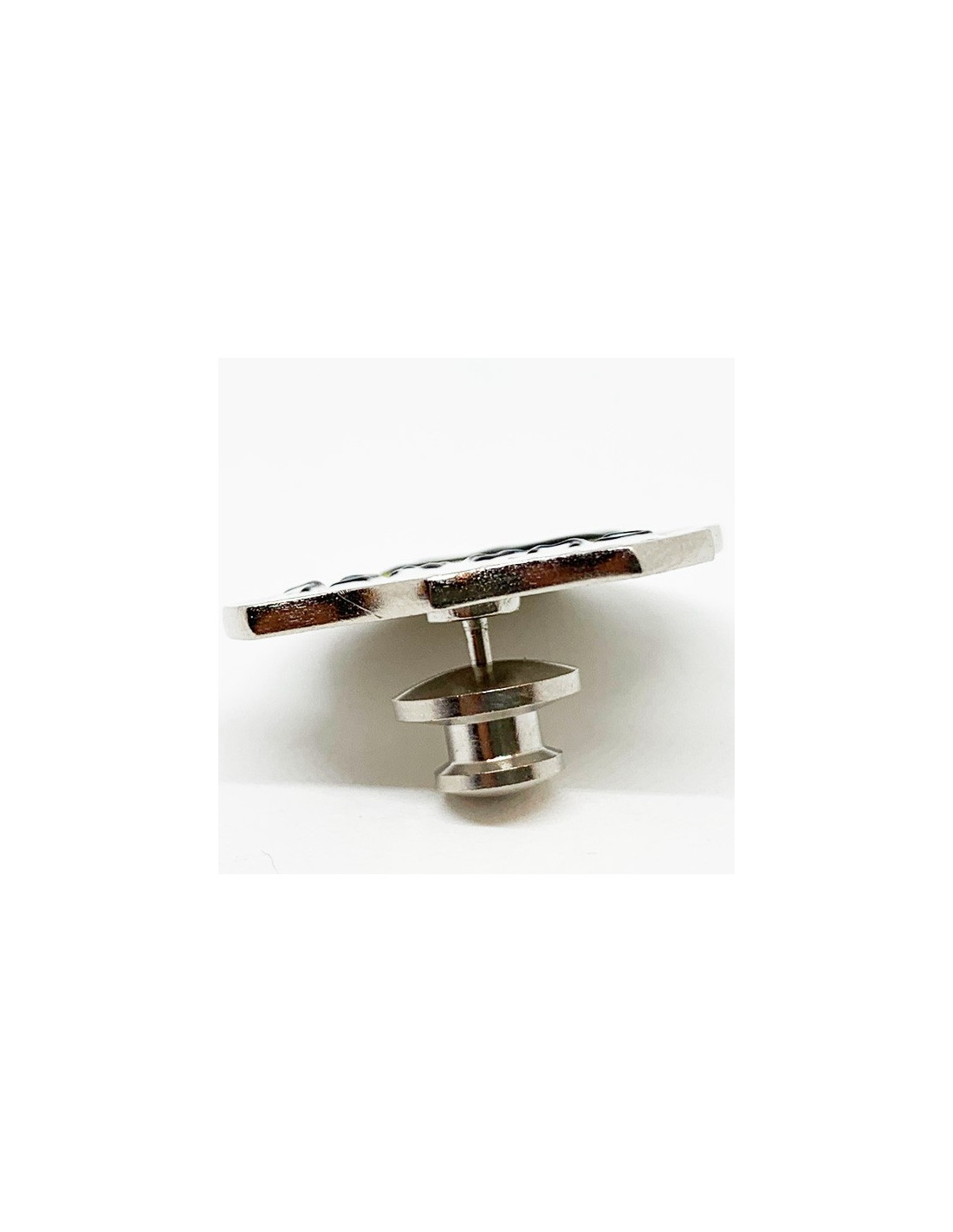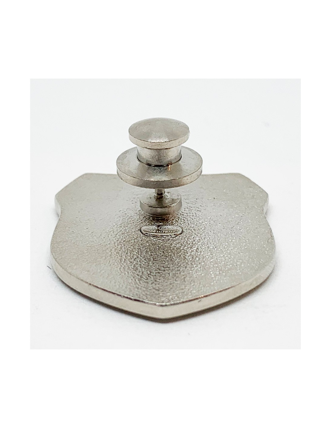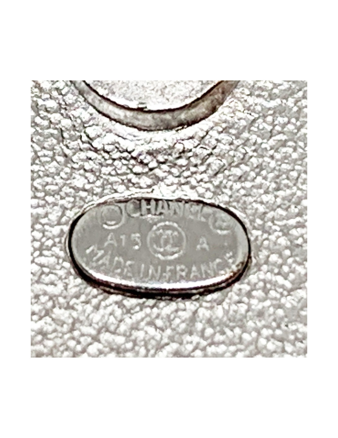 This CHANEL pin is in very good condition. It measures 3 centimeters high and 2.5 centimeters wide. This pin is shaped like a coat of arms. On the back, the metal is grained. There is the typical pin fastener measuring 7 millimeters, as well as the CHANEL hallmark indicating that this accessory dates from the Fall 2015 collection and was made in France.
