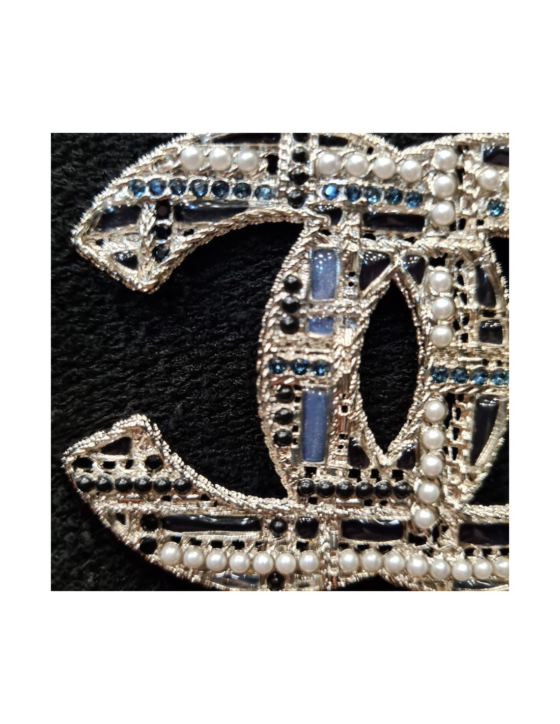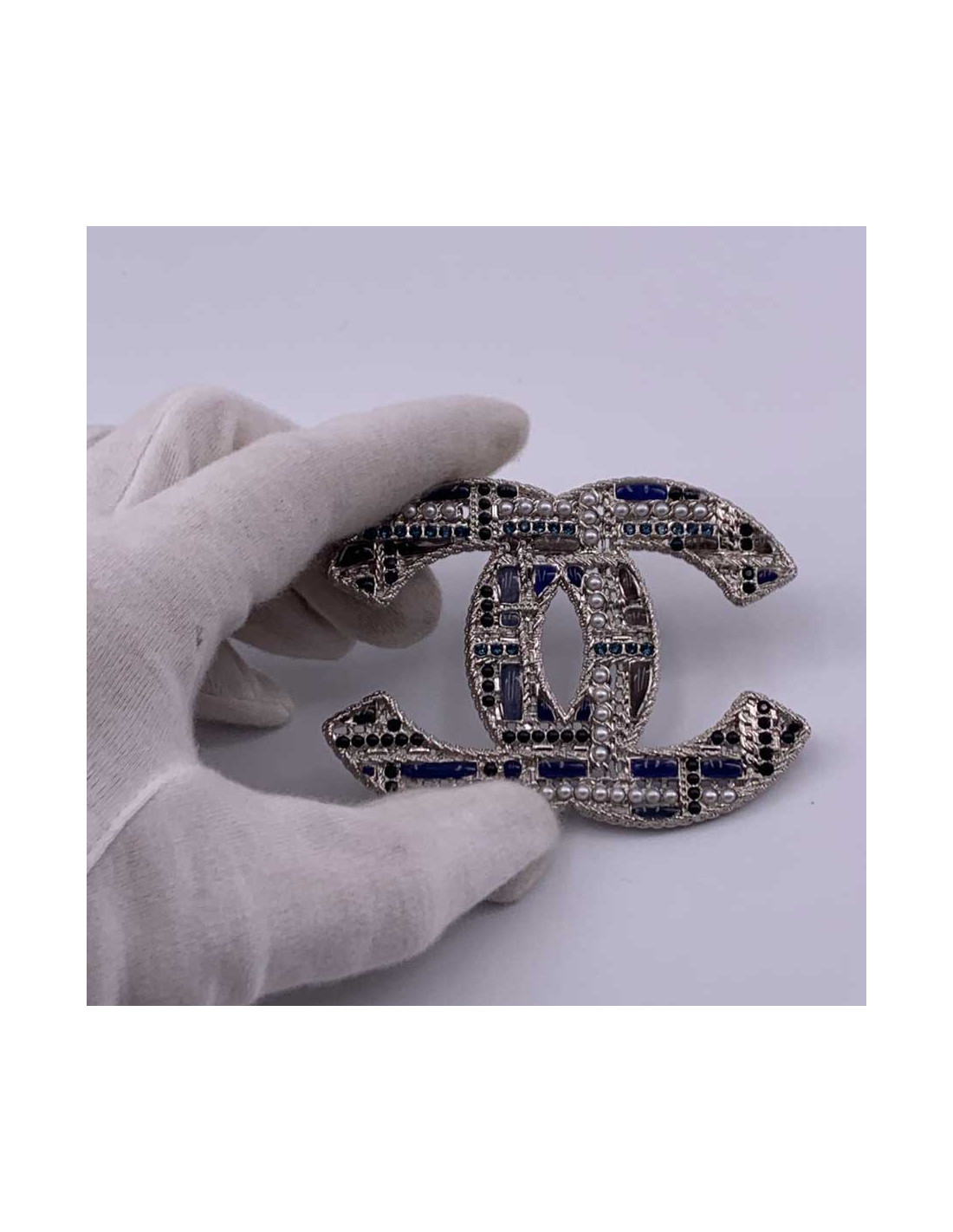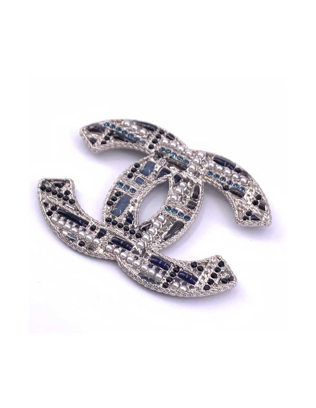 The brooch is superb. The CC of the Chanel brand is here in large version, in silvery metal, on which come to be encrusted small pearls, black, and blue green rhinestones.