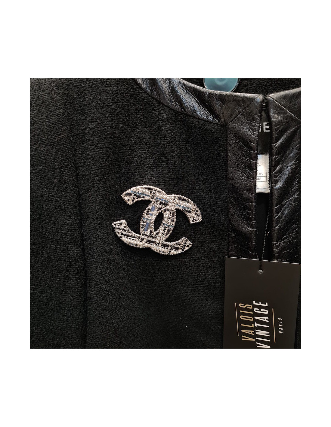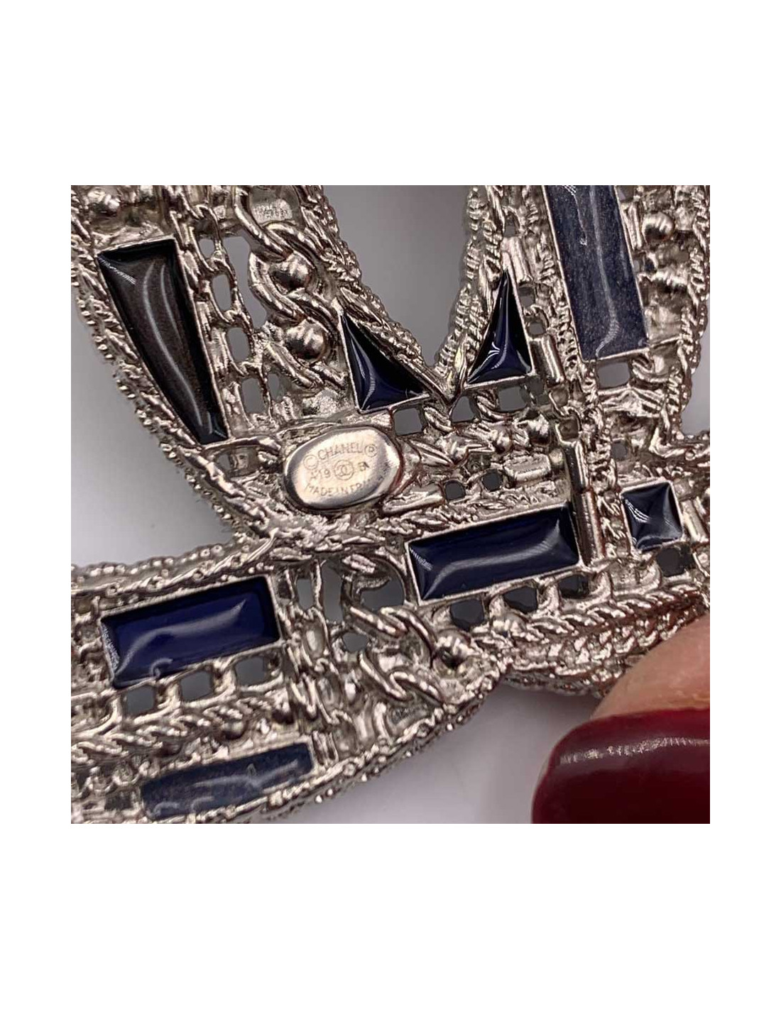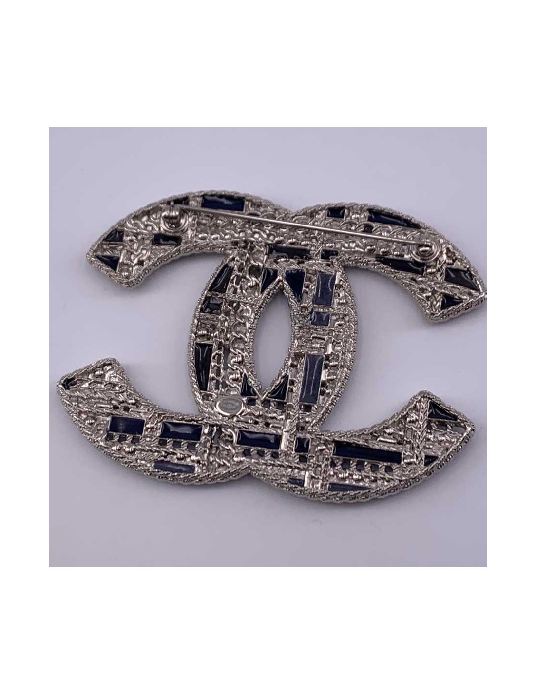 The brooch is superb. The CC of the Chanel brand is here in large version, in silvery metal, on which come to be encrusted small pearls, black, and blue green rhinestones.