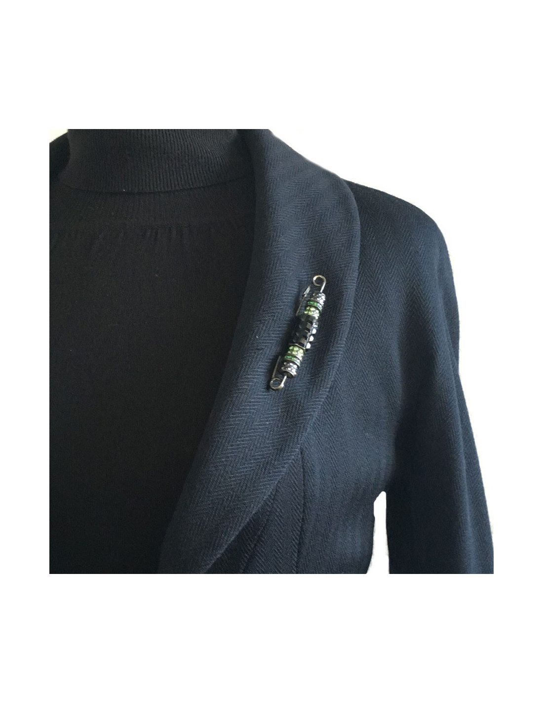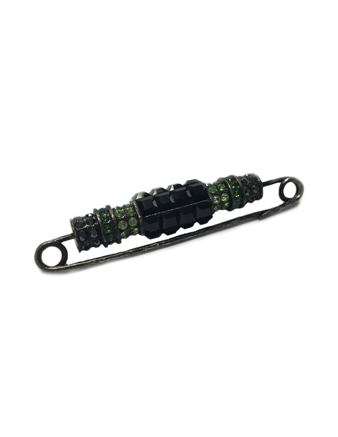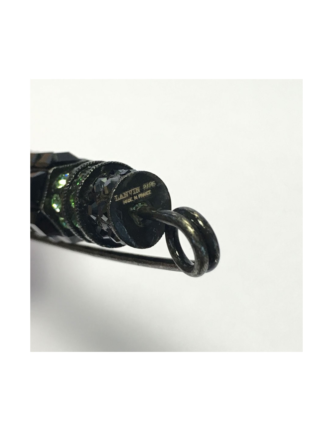 LANVIN pin brooch in blackened silver metal and rhinestones in various colors (green, blue, gray and black). Never worn. Brand stamp present.