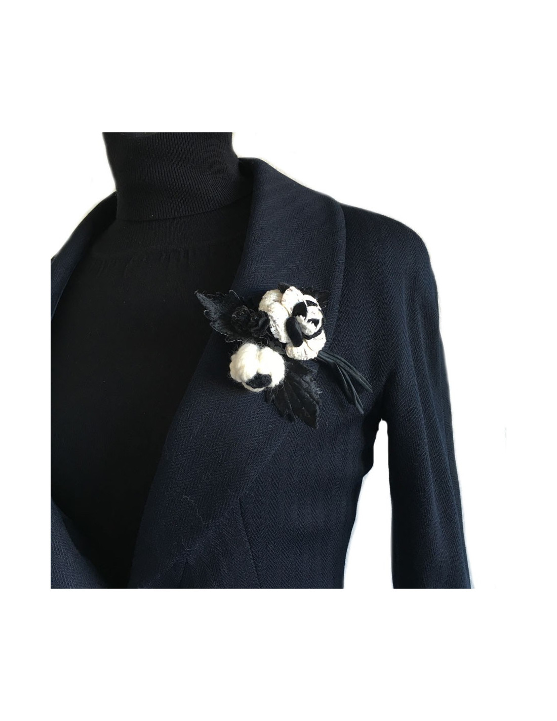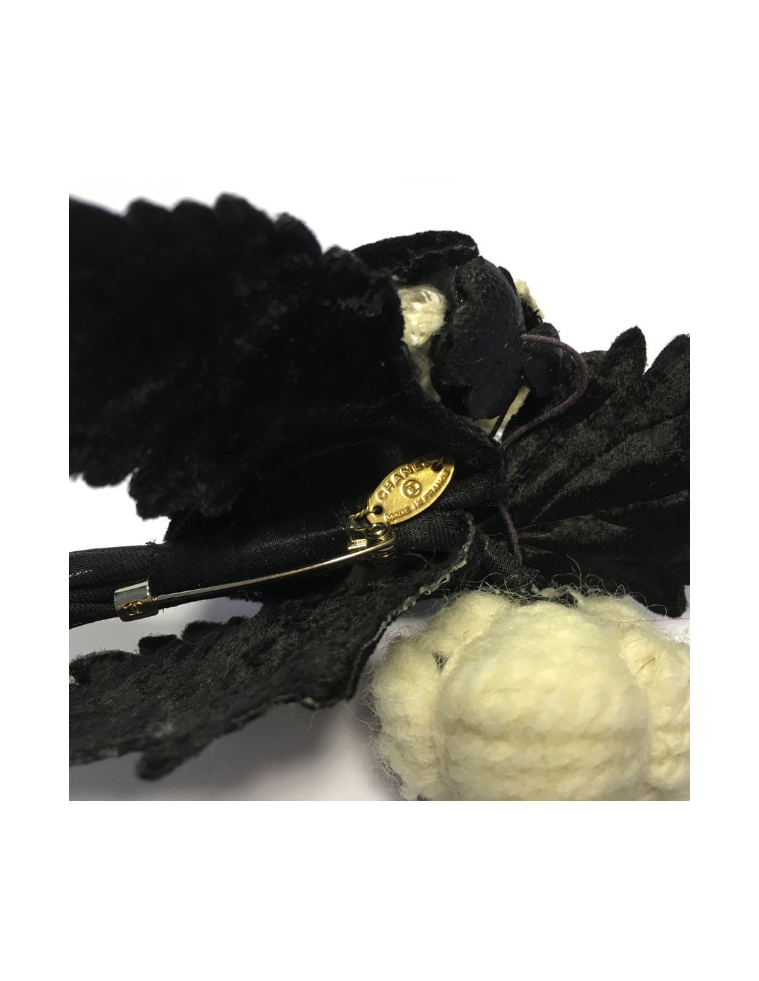 Last items in stock PINS-BROOCHES CHANEL sea-green cotton camellia brooch CHANEL 30861 210.00 € CHANEL cotton camellia brooch Condition :descent (needs to be cleaned)Made in FranceMaterial : cottonColors : sea-green, black, whiteMeasurements : 8 x 8 cmStamp : noHardware : gold finish metalDetails : petals made of padded cotton. fine black and white stripes Add to cart