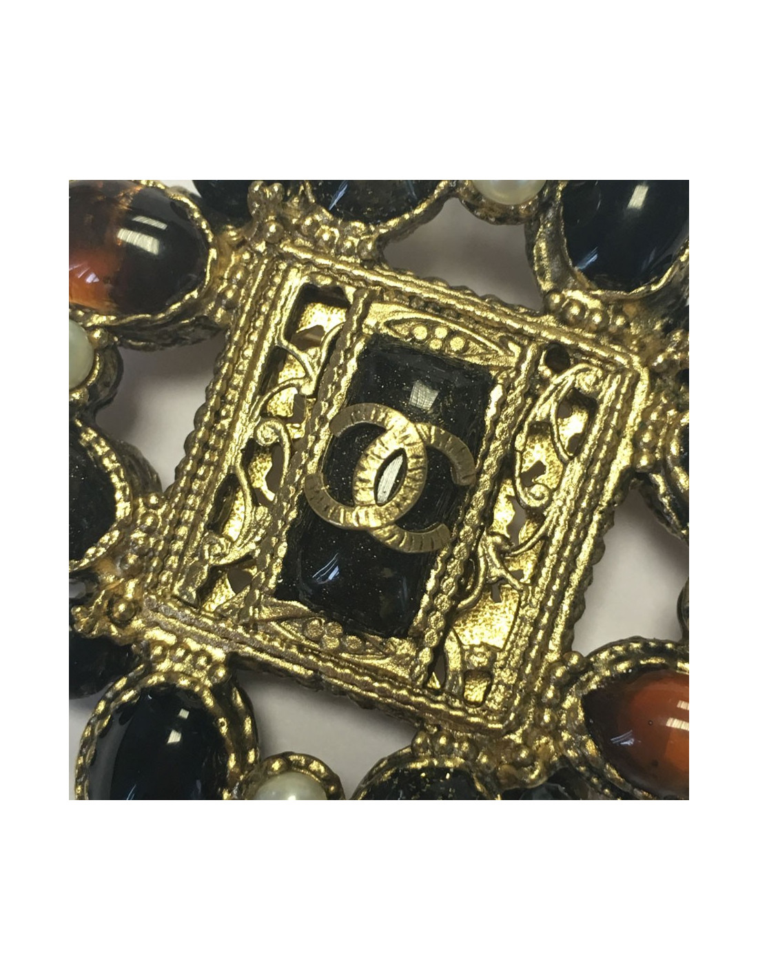 Sublime CHANEL brooch in gold metal filigree, glass in shades of amber and glitter and Pearly beads. A CC attached on a paste of glass at the center of the PIN.