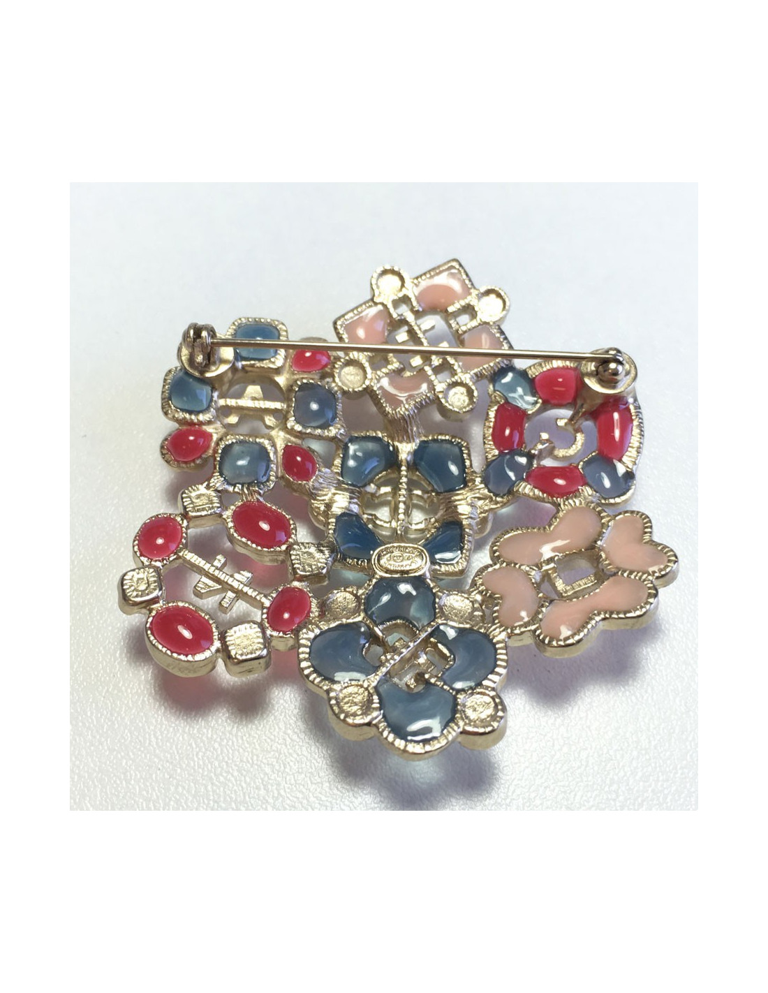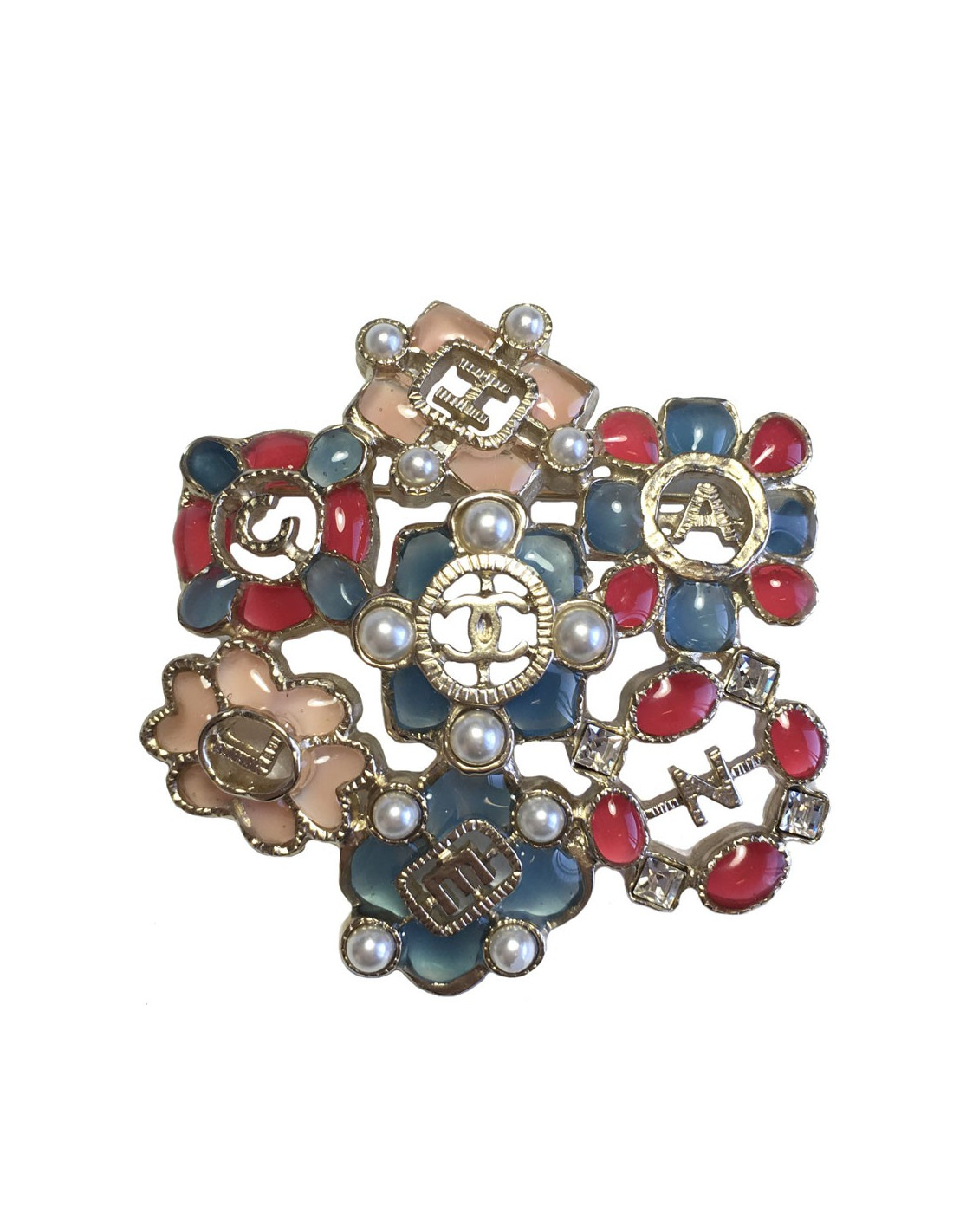 Superb Chanel brooch in pale gold gilded metal, with inlaid blue, pink and fushia resin, pearls and rhinestones.