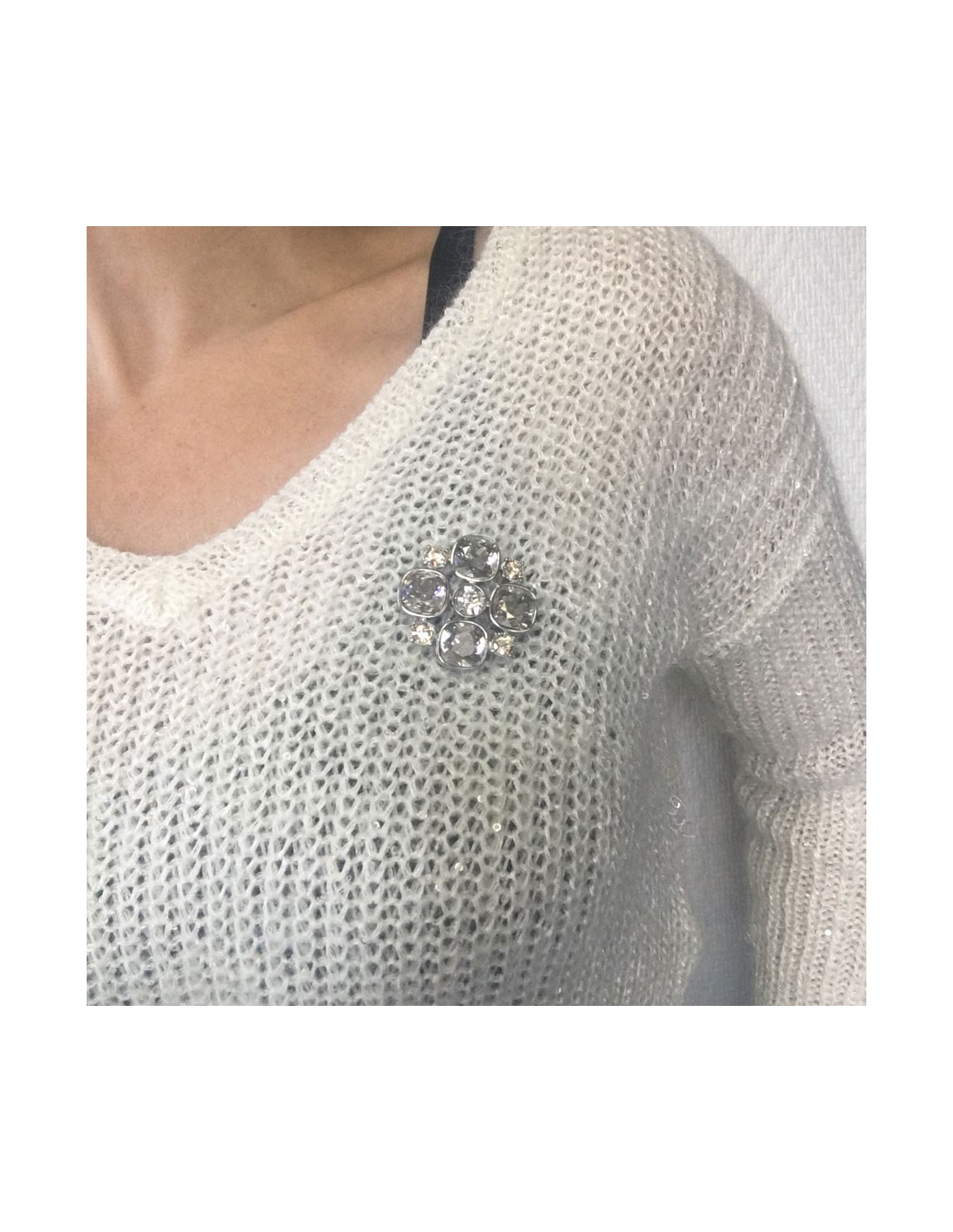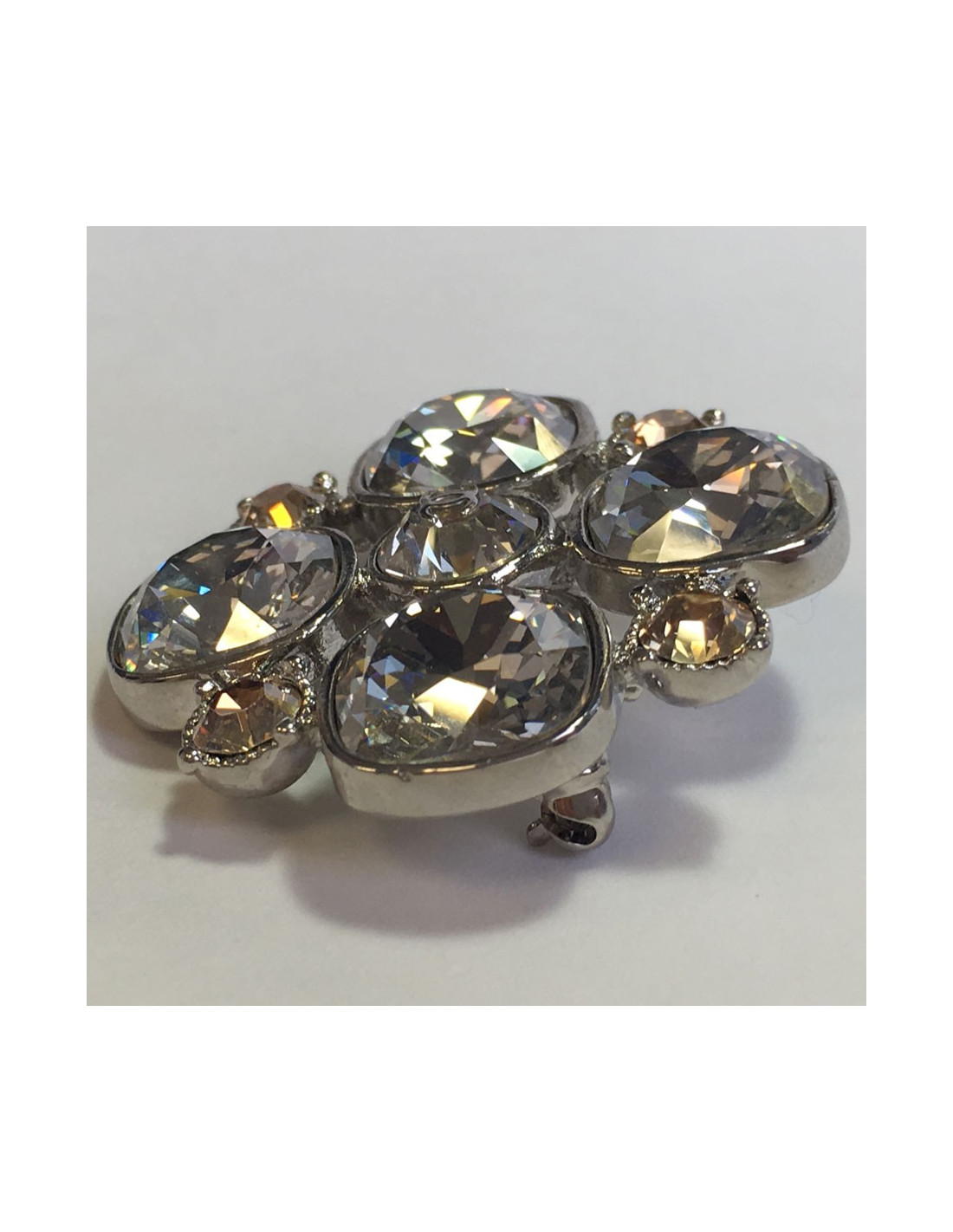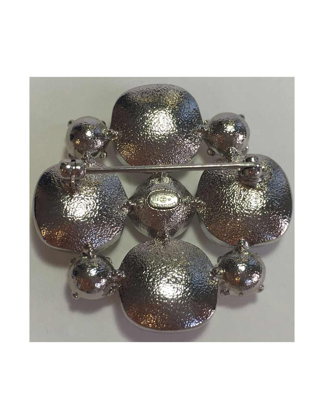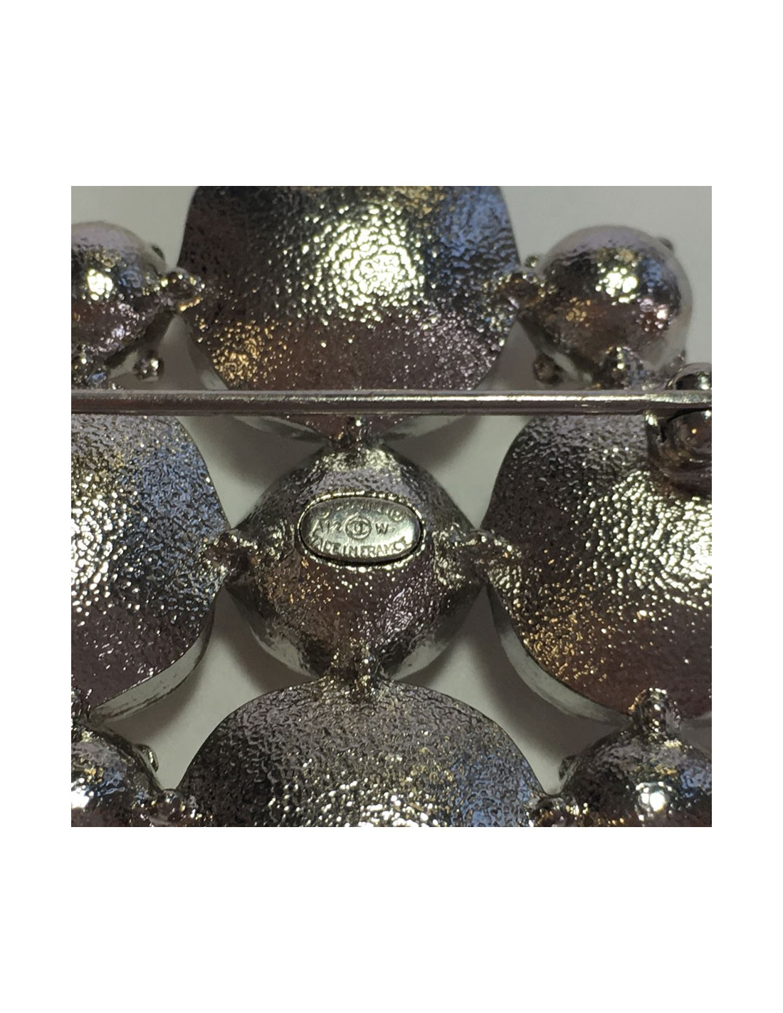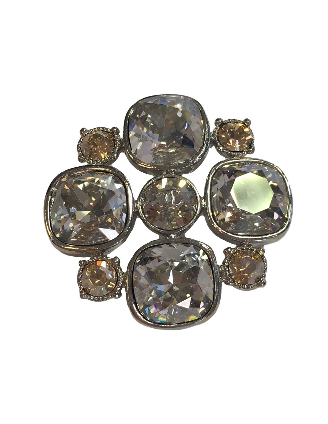 Superbe broche CHANEL en métal argenté serti de strass blancs et jaunes, taille coussin. Un petit CC argenté sur le strass central.