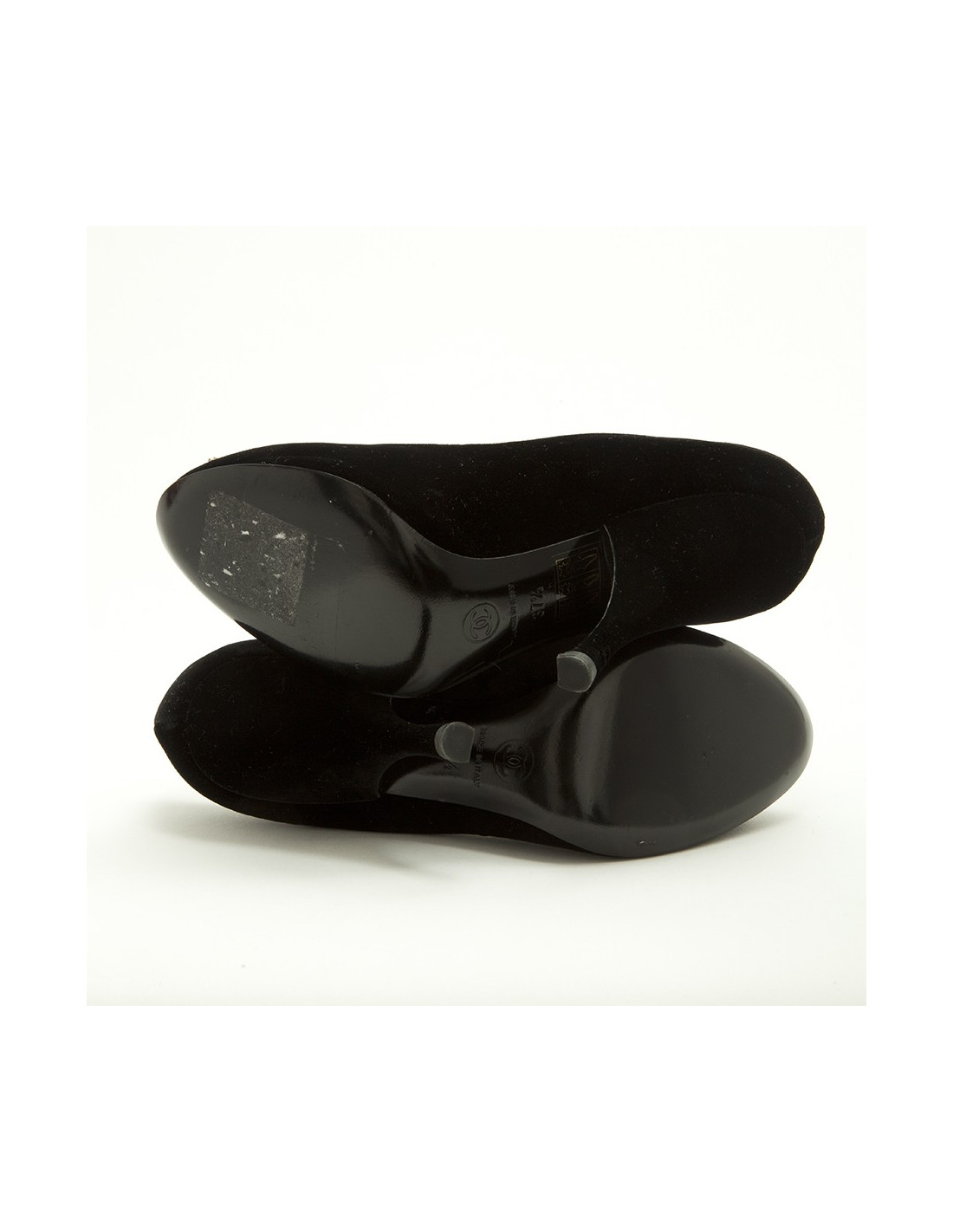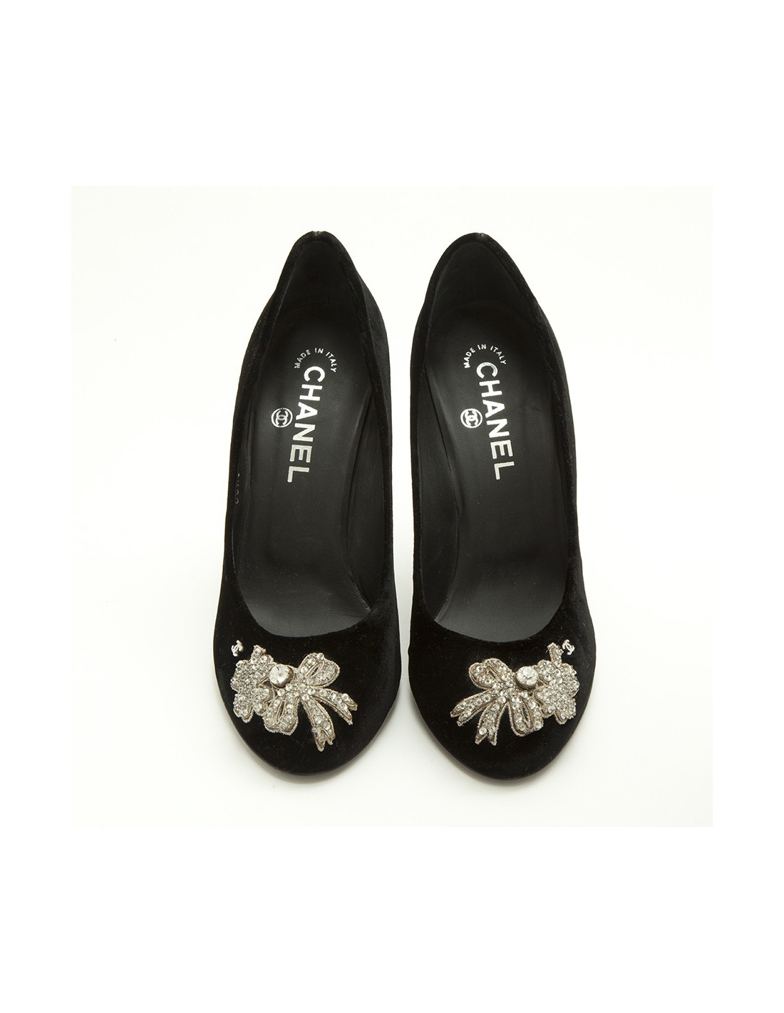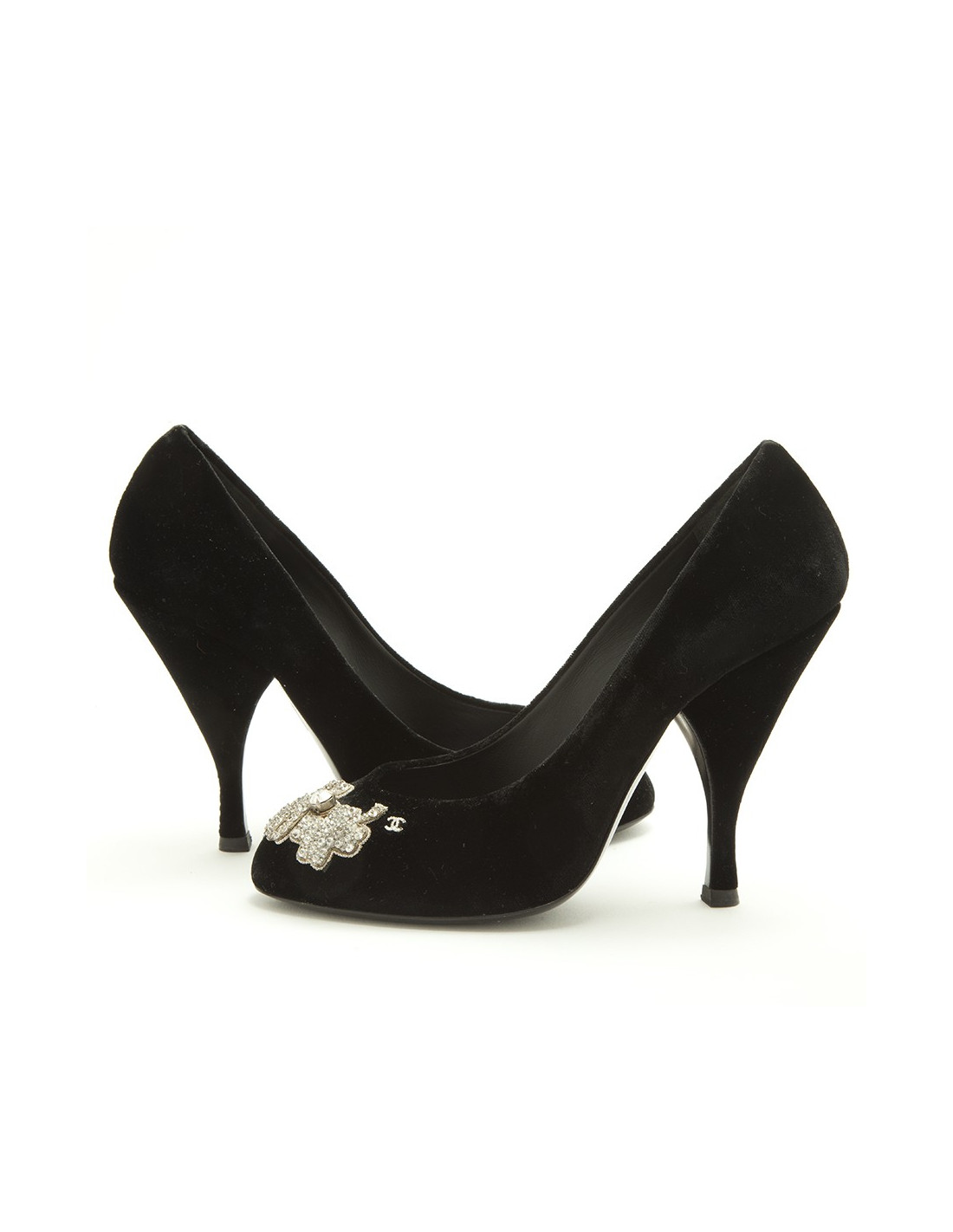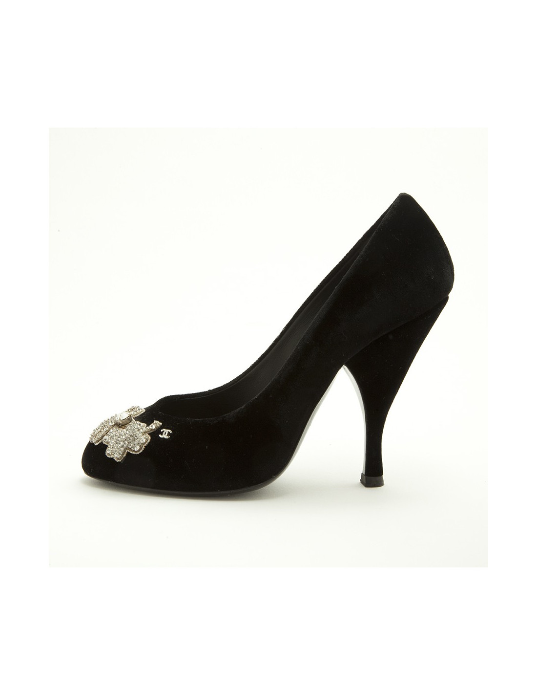 Very elegant Chanel pumps. They are made of black silk velvet embellished with silver embroidery, as well as a discreet "CC rhinestone." These pumps were worn only once during an indoor night.