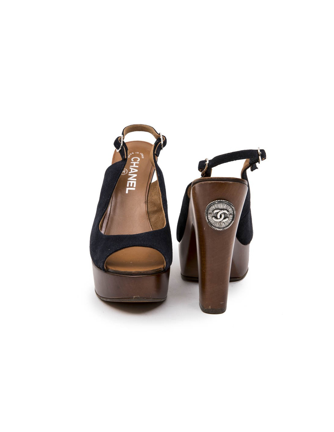 Chanel clogs mules in wood and navy velvet calfskin. Size 39.5. Silver metal parts.
