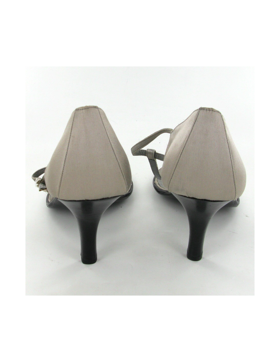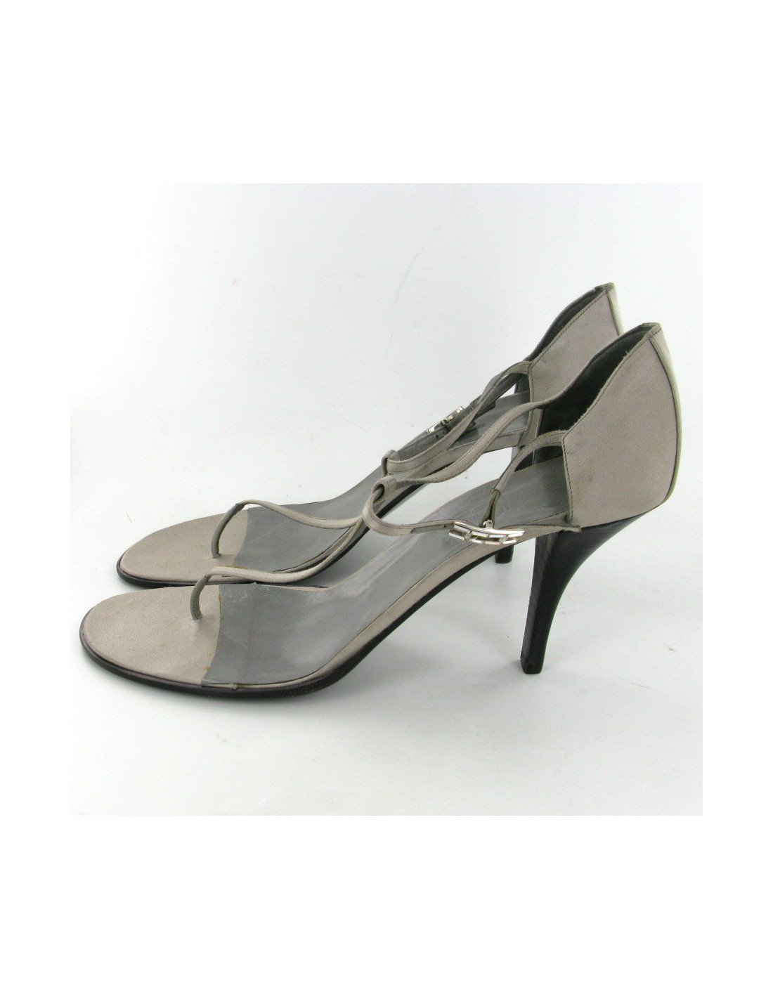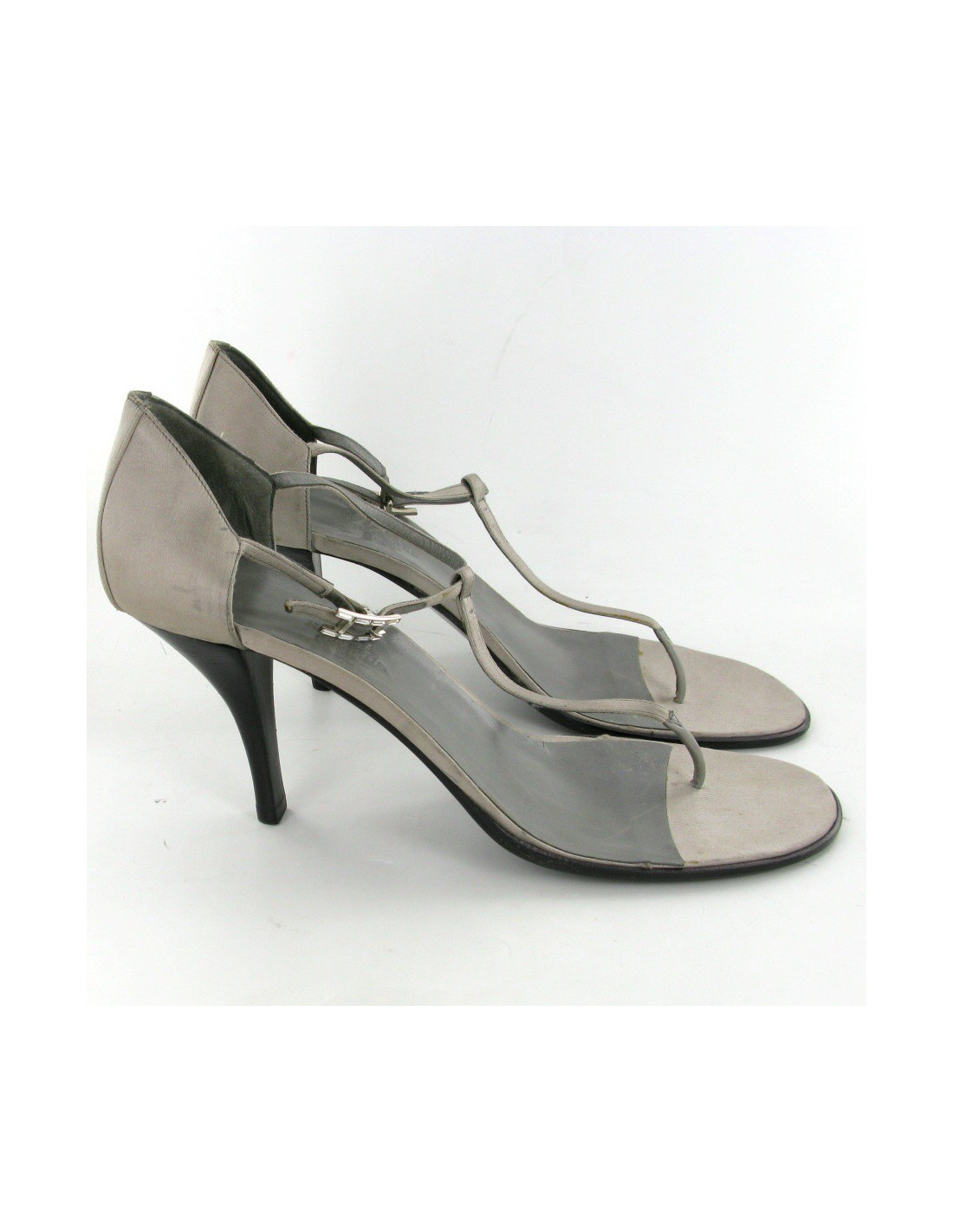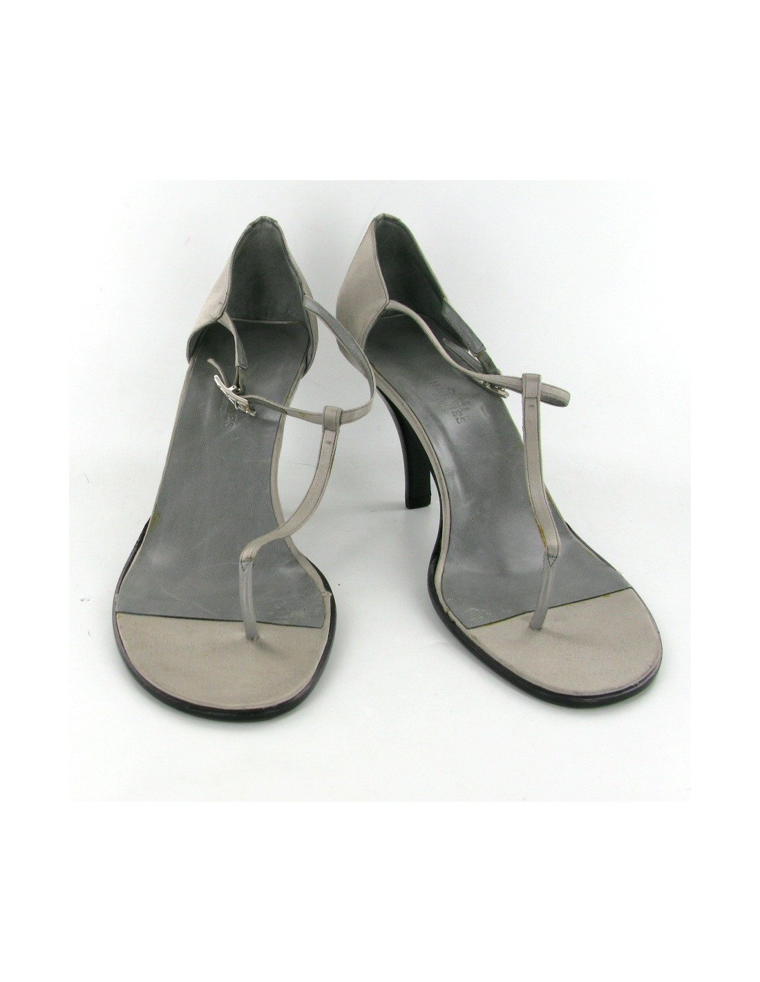 HERMES T40 Sandals grey vintage satin. The H loop on the ankle strap is silver metal and rhinestones of rectangle shape. The outsole is leather. The insole consists of gray leather 3/4 and 1/4 gray satin.