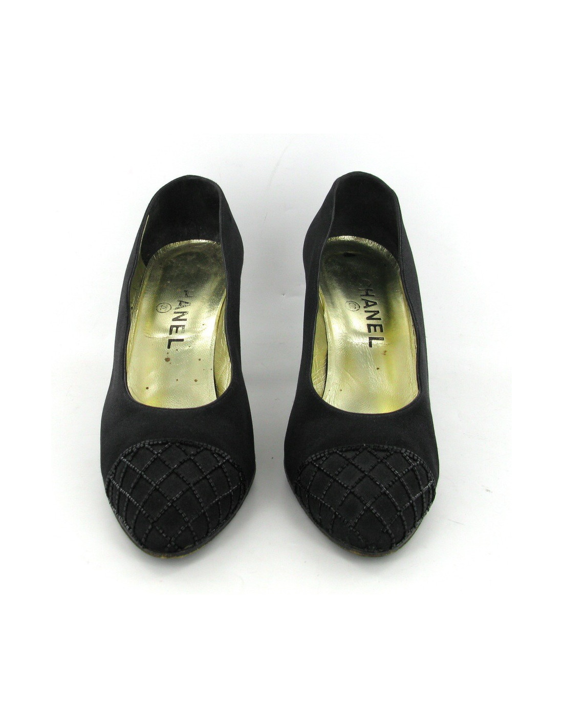 Shoes CHANEL COUTURE vintage black satin and beaded end. The insole is leather Golden acronym writing and the CHANEL logo. The outsole is black leather.