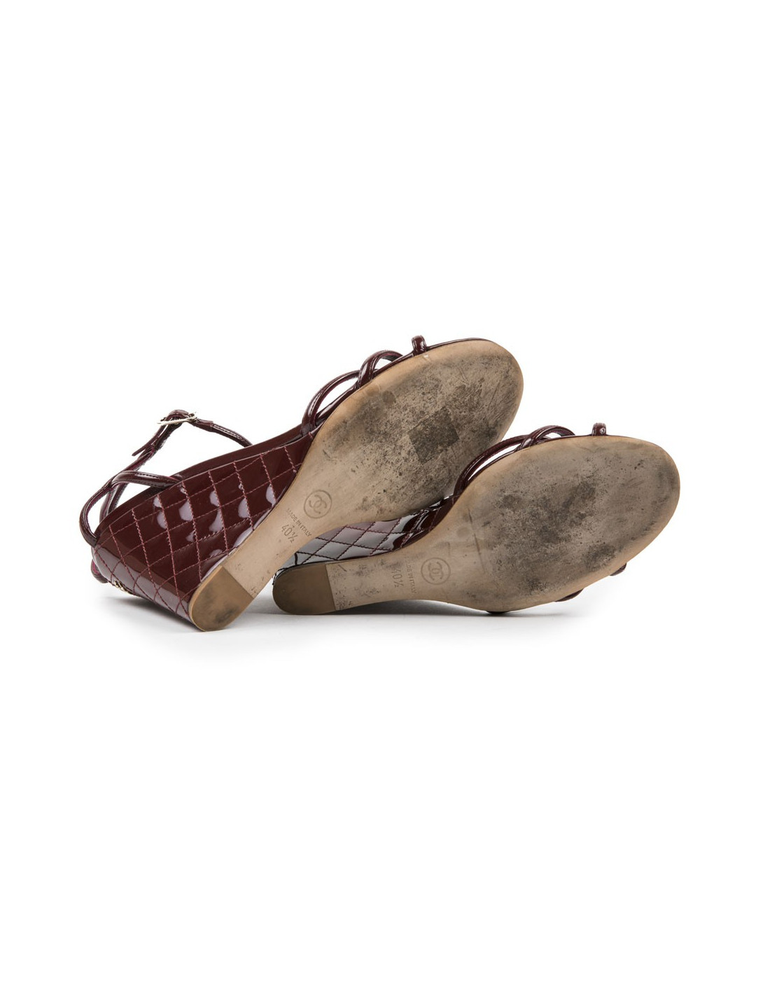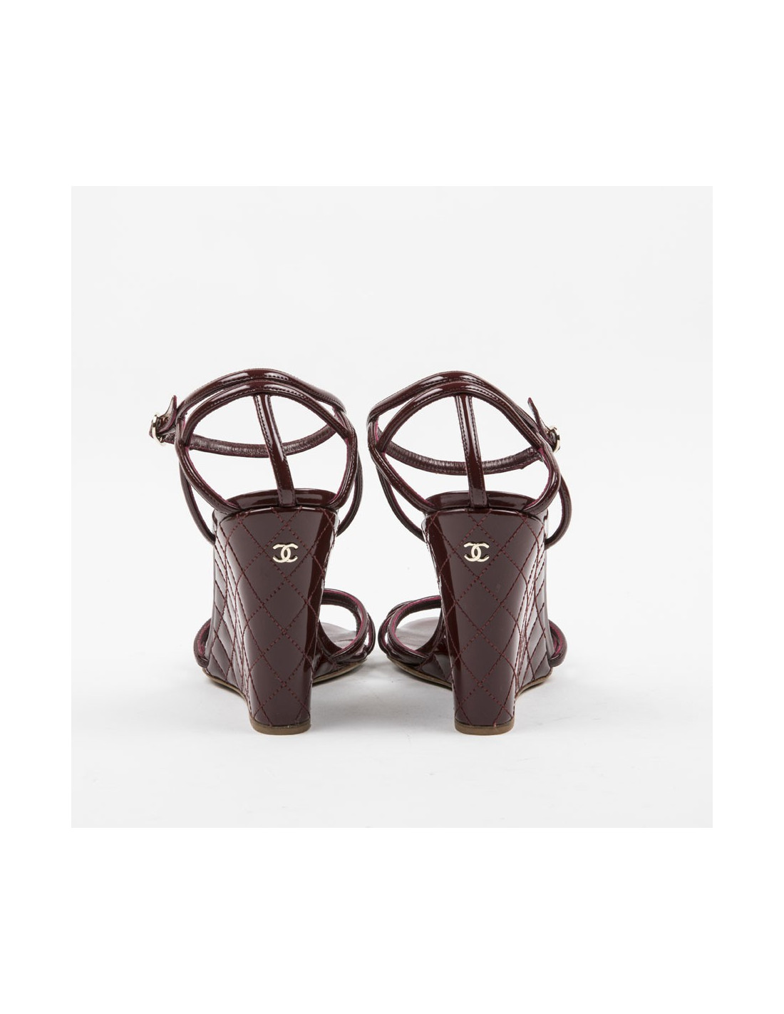 Chanel wedge sandals in burgundy quilted patent leather. Acronym 'CC' in gilded metal on the back of the shoe. Outsole and inner sole in genuine leather.