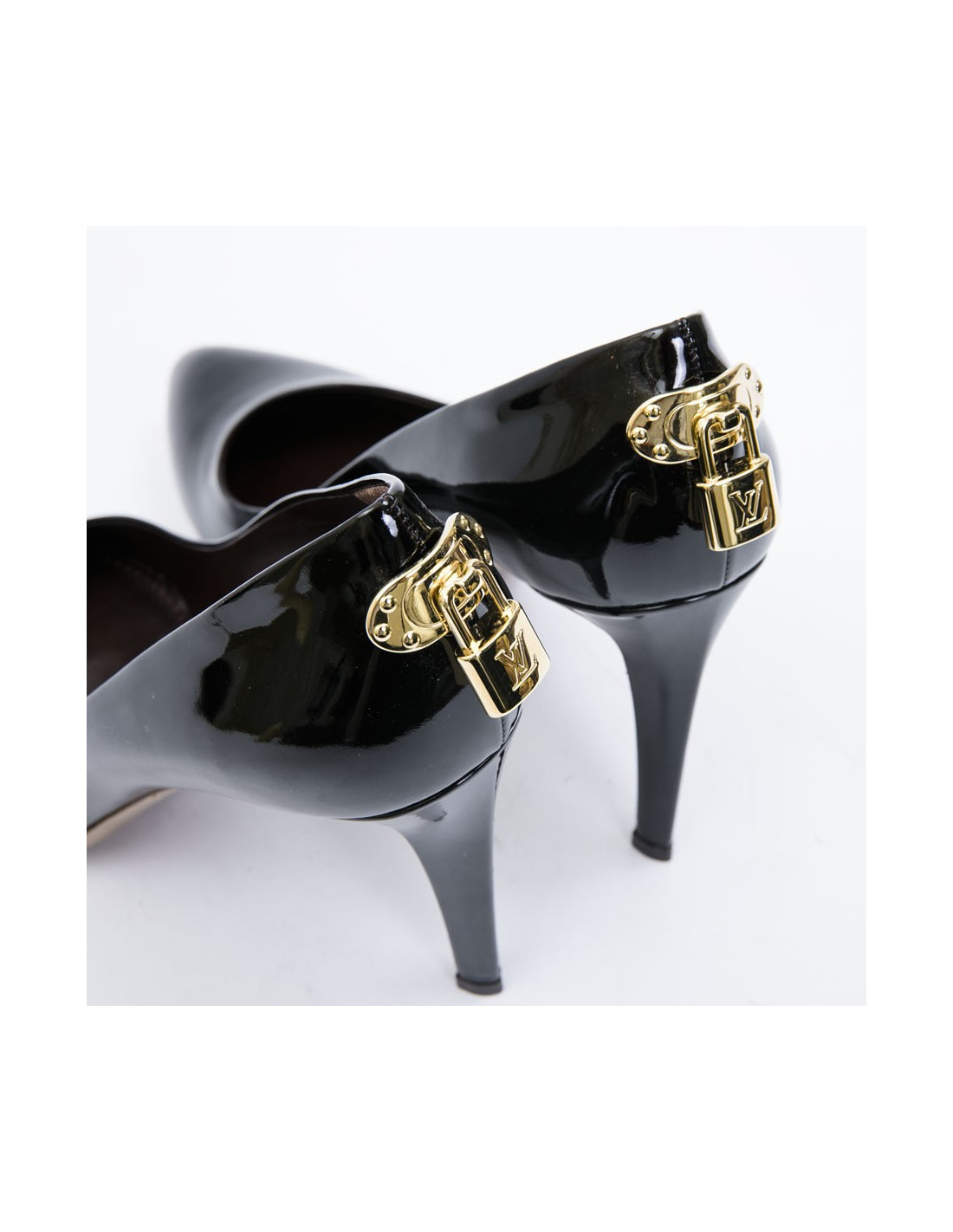 Louis Vuitton 'Oh Really' high heels model, in black patent leather, size 39.5FR. Gold metal padlock with LV engraved signature on the back of each foot. Heels in black patent leather. Genuine leather insoles and outsoles