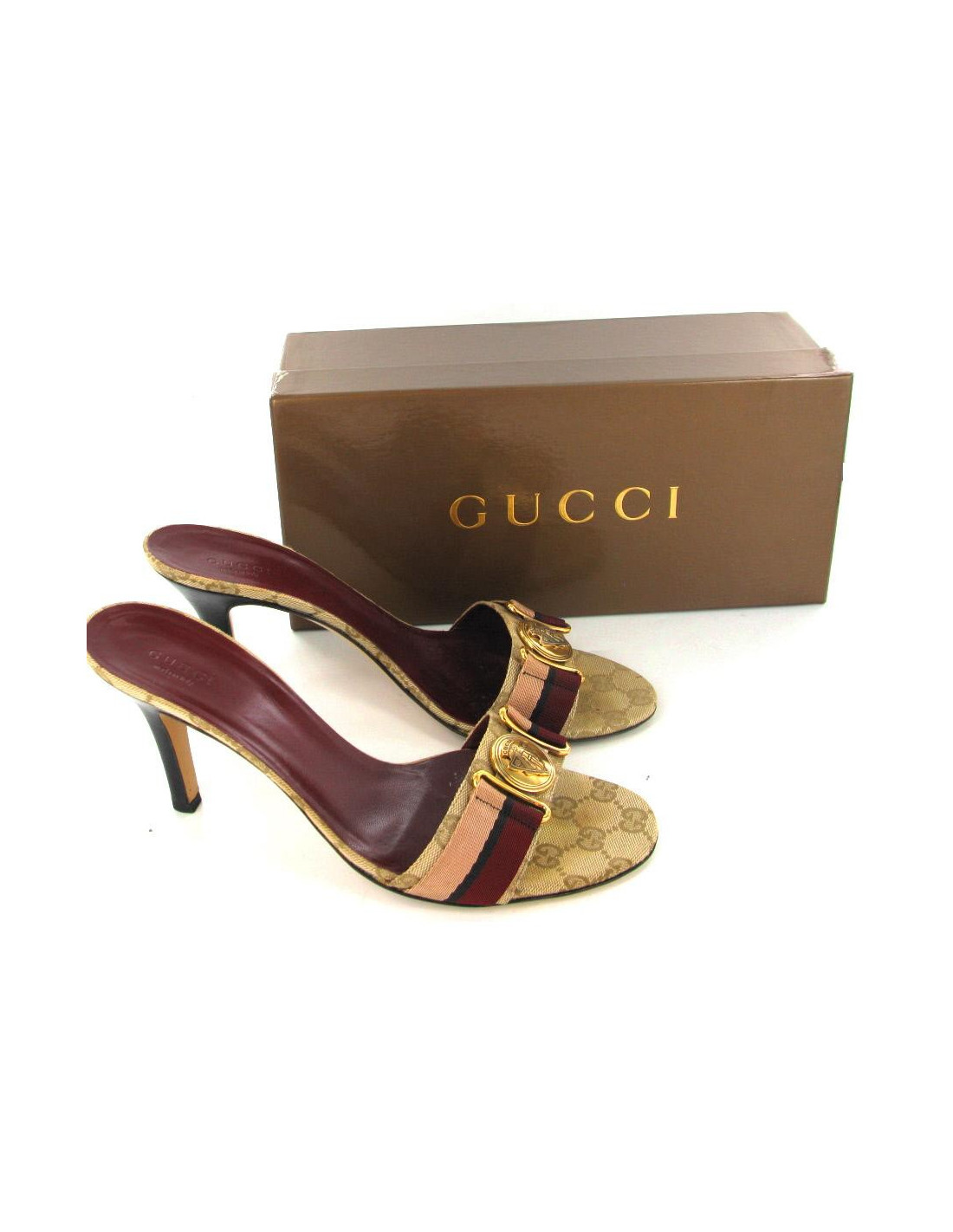 Mules GUCCI T39.5 Canvas monogrammee GG beige and ebony with a Burgundy leather surround. The ground is made of metal pale gold mixed with tri-color fabric (bordeaux, ebony and beige).The inner and outer sole is made of leather. They are in good condition and supplied with their original box.