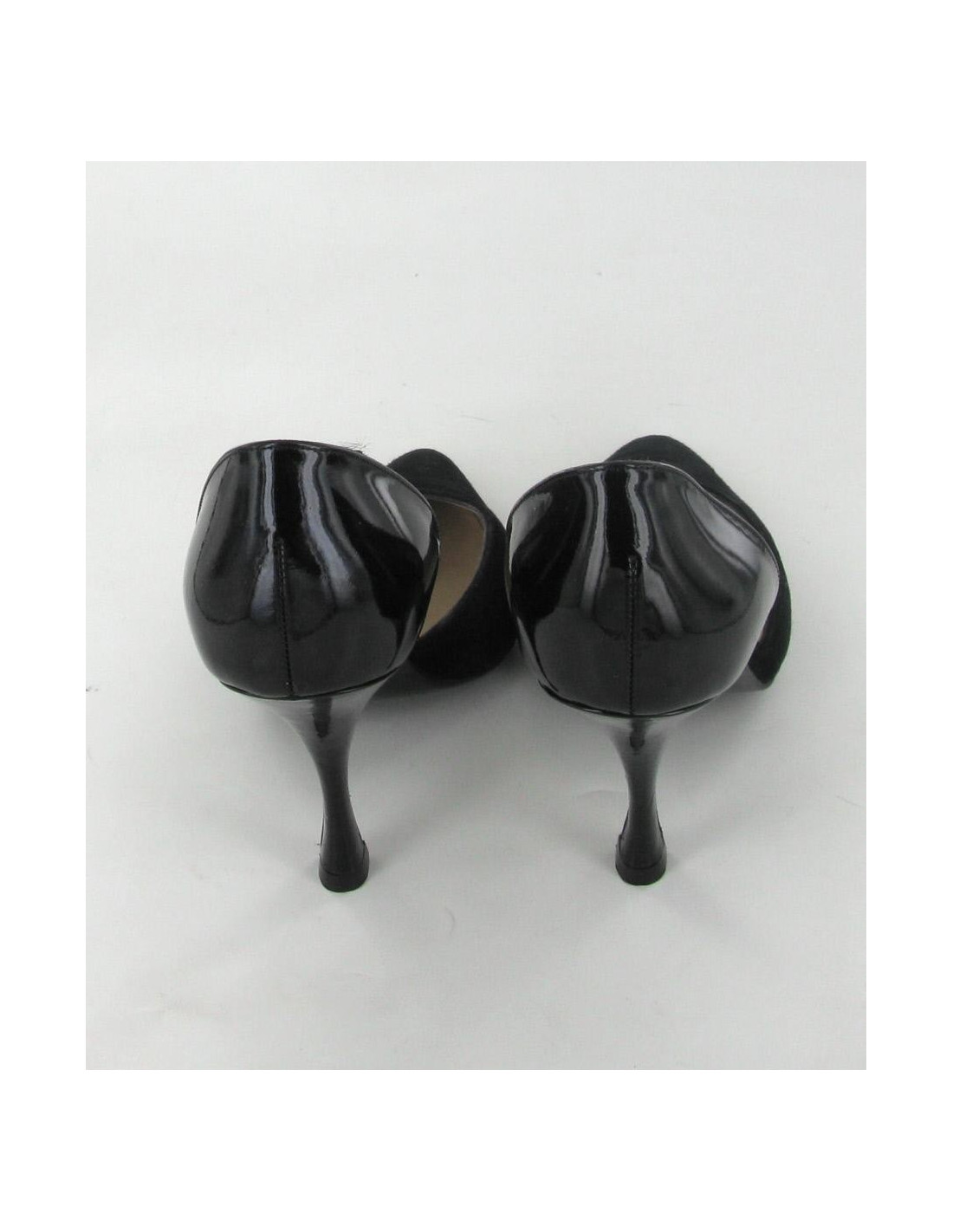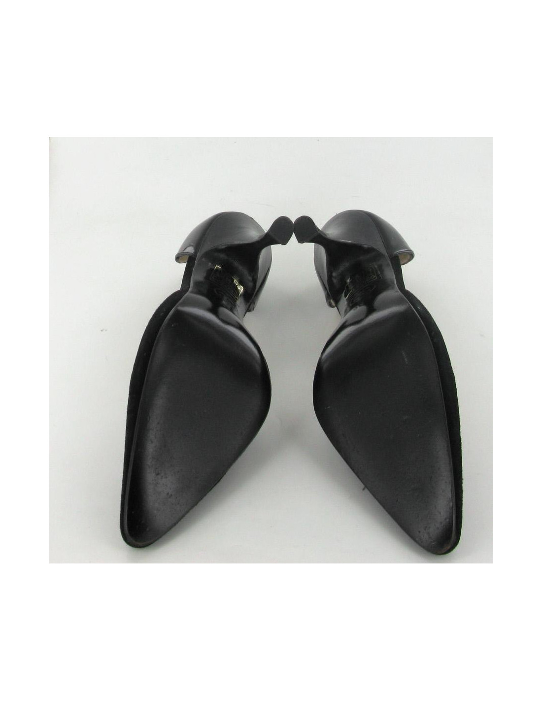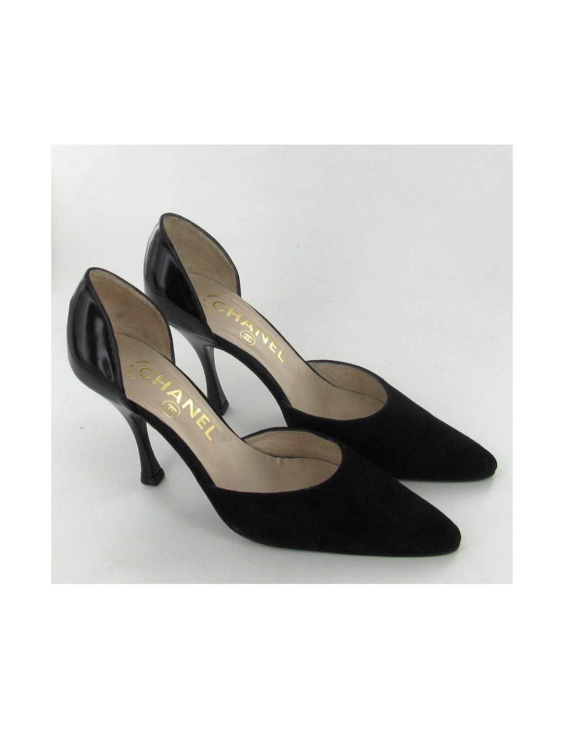 Chic stilettos and elegant CHANEL T36 in black suede and leather Polish. Inner and outer soles are leather. They are comfortable and in very good condition. Light marks very inconspicuous on the varnish of the heel. these soles have been brought only 2 times.