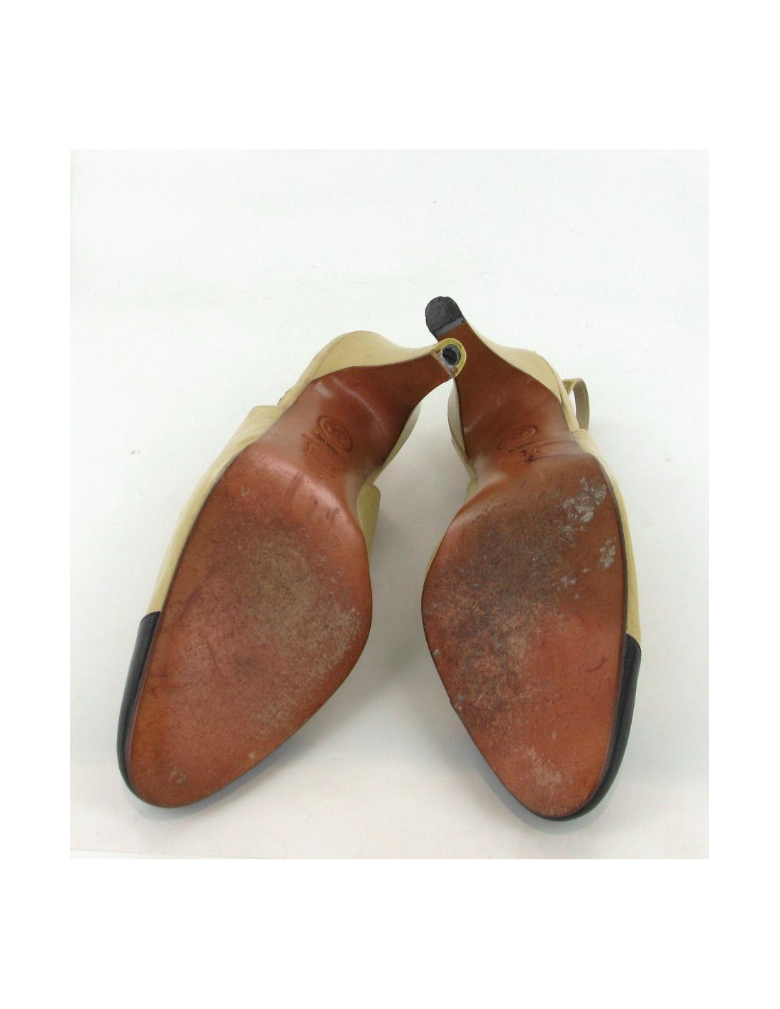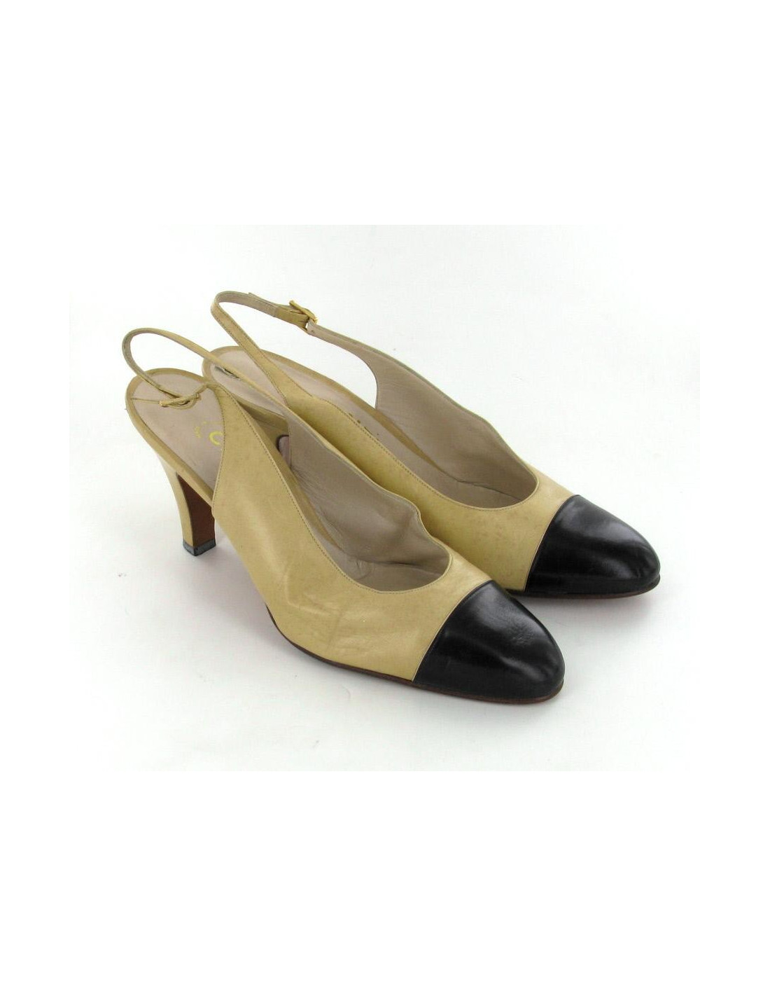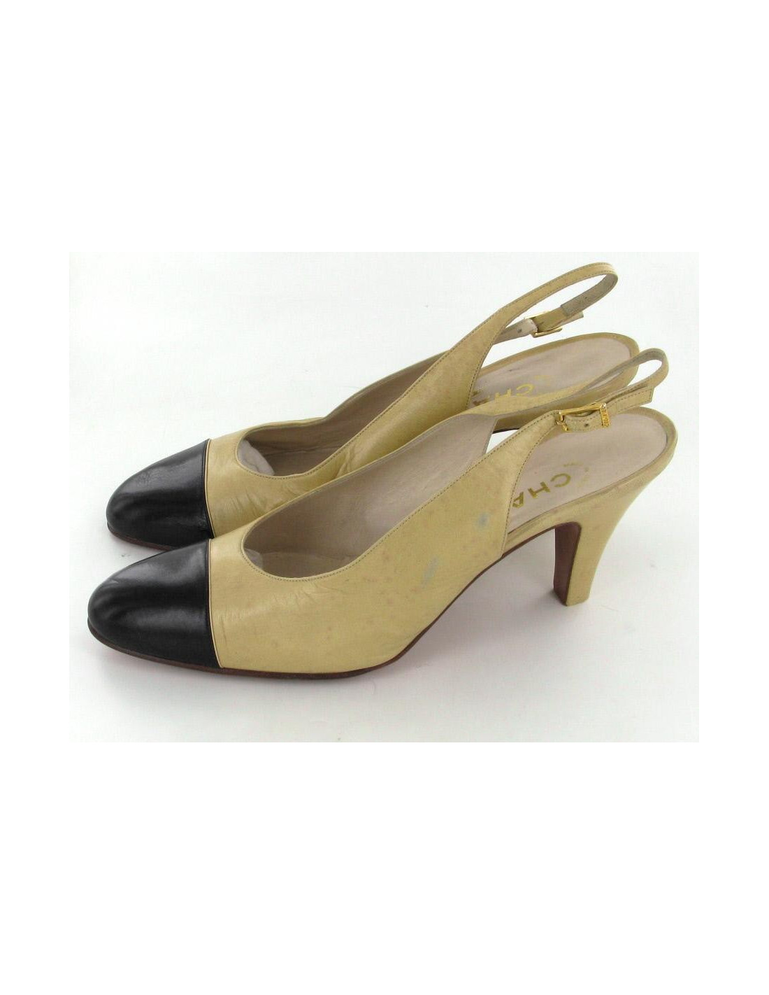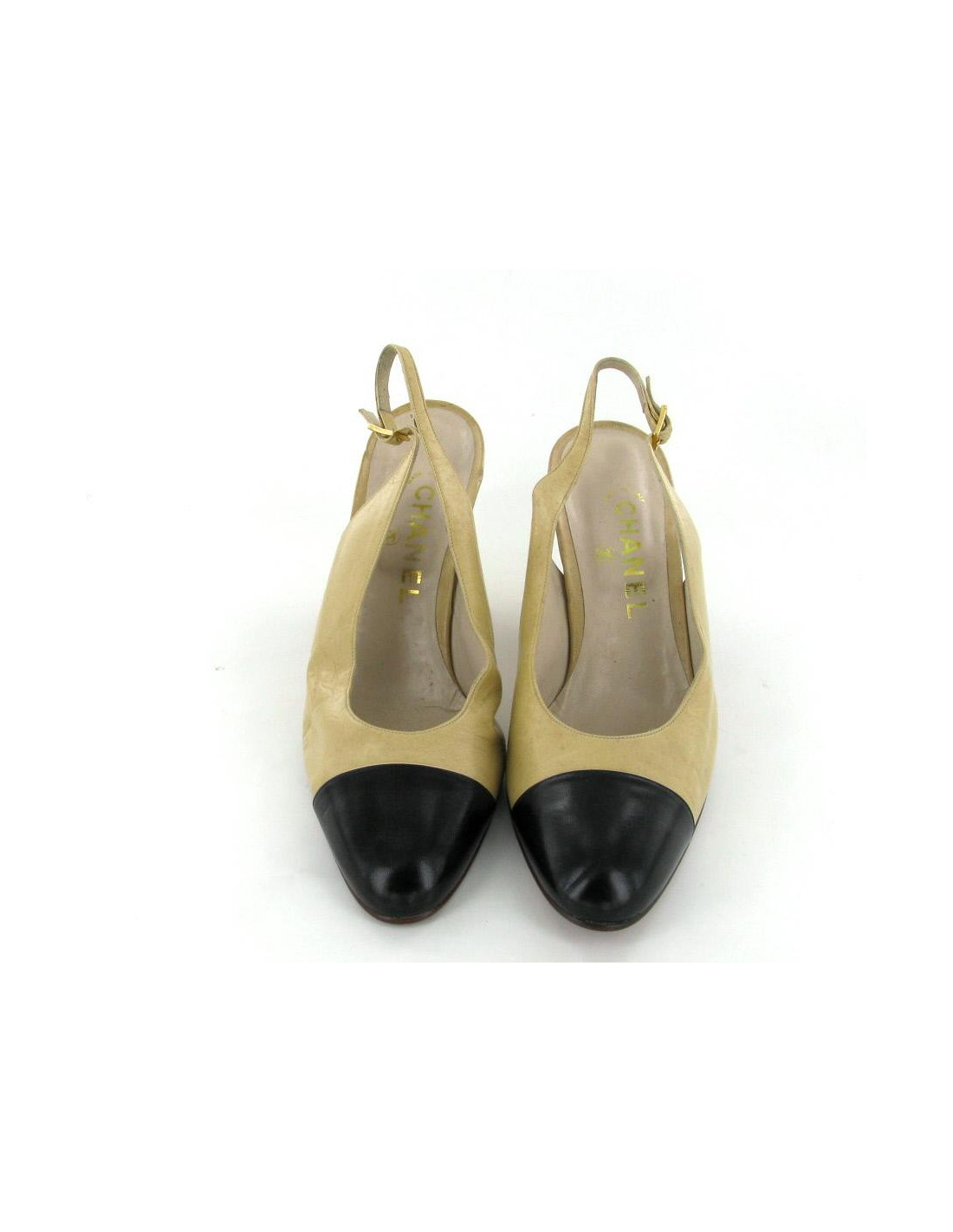 Classical and mythical two-tone CHANEL pumps, beige and black T39. The clasp of the strap is metal gilt with the inscription "CHANEL" engraved on it. It is noticeable traces of wear and small spots. They are in good condition.