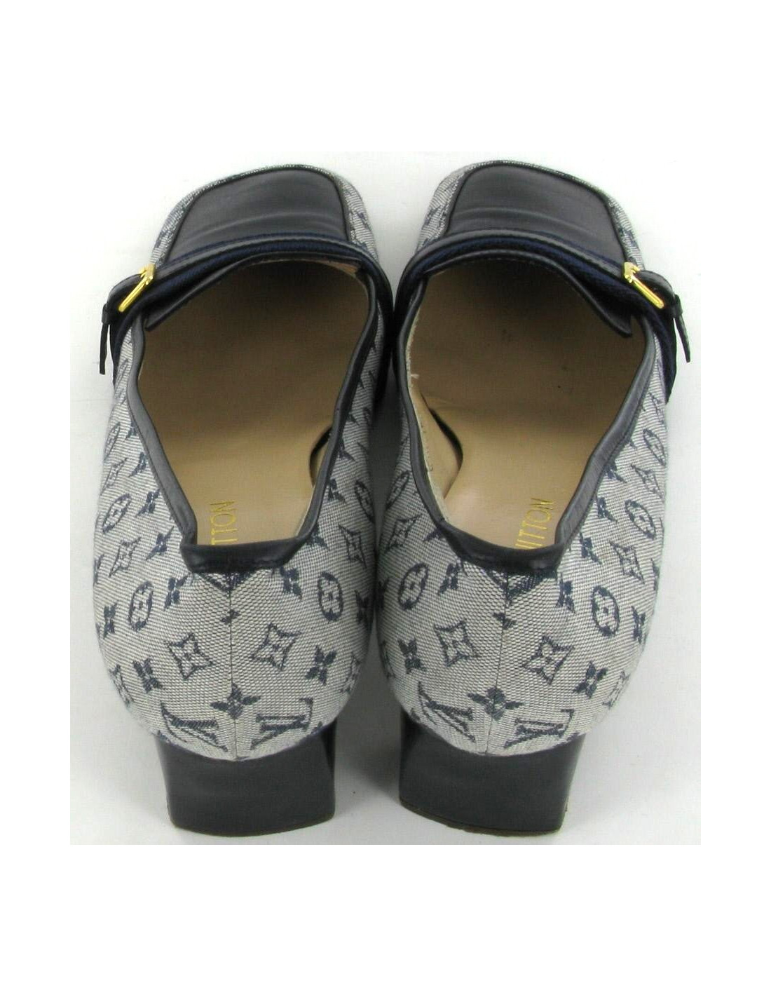LOUIS VUITTON moccasins with heels Navy blue leather and canvas Monogrammee, size 40. This pair in good condition has a very modern square shape. Leather covered heel is Navy Blue. Beige leather inner sole. Small strap canvas and marine blue leather, buckle gold metal. Made in Italy.