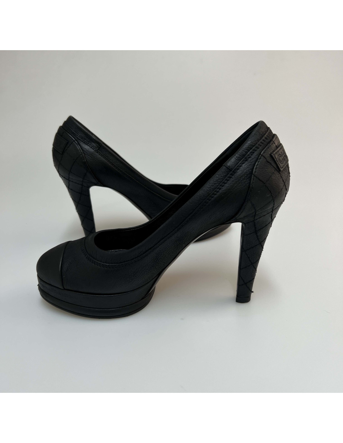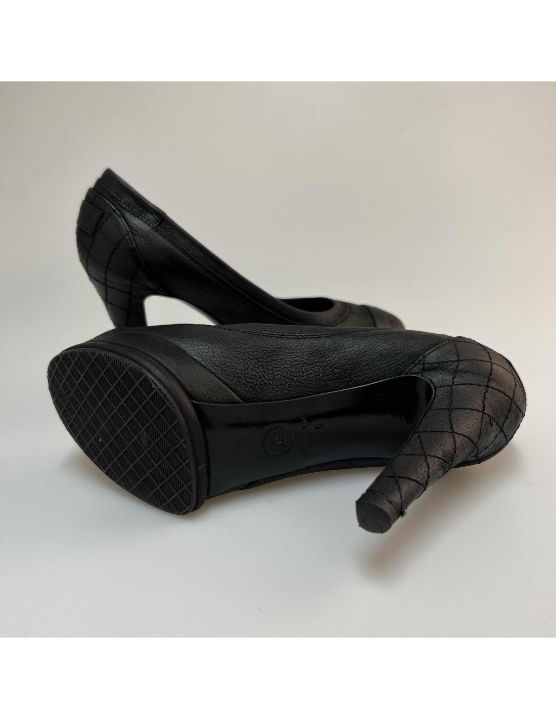 Last items in stock PUMPS - WEDGES Couture Chanel T 40 pumps in black Duchess satin CHANEL 18607 280.00 € Couture Chanel pumps black T 40 en Duchess satin, and end in black Spades. In very good condition (insole has the golden color passed). The heel height is 8.5 cm, the width of the outer sole is 7 cm, the inner length of the sole is 25 cm. Will be delivered in a dustbag Valois Vintage Paris and one other box. Add to cart
