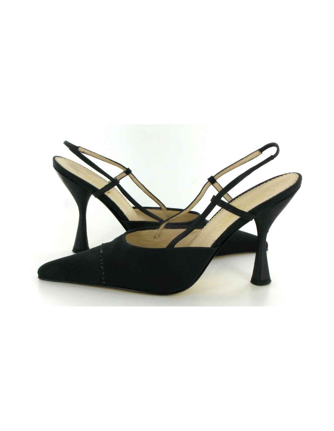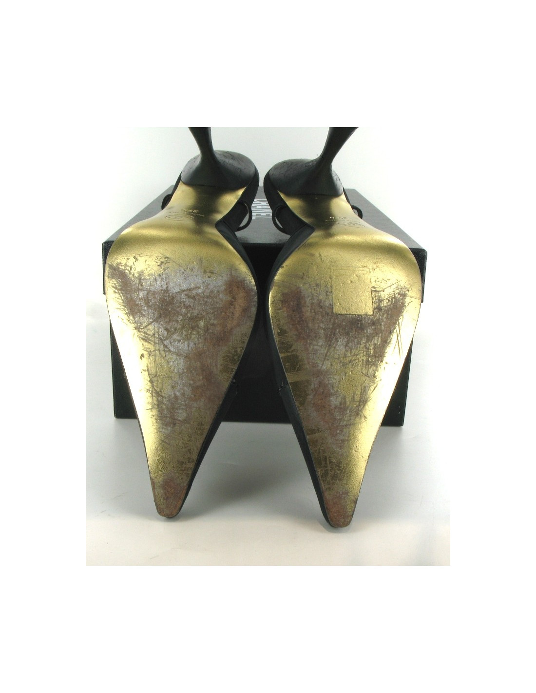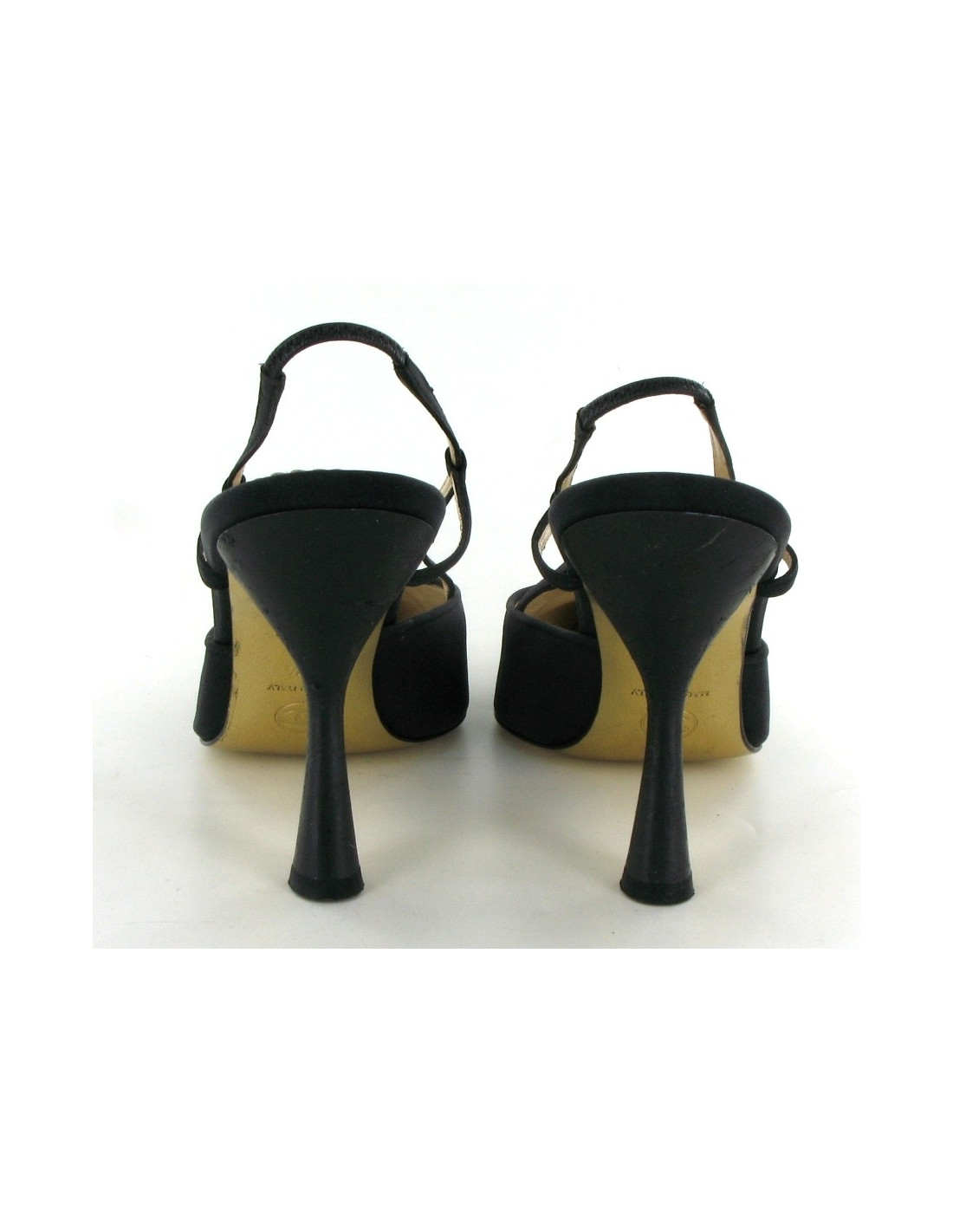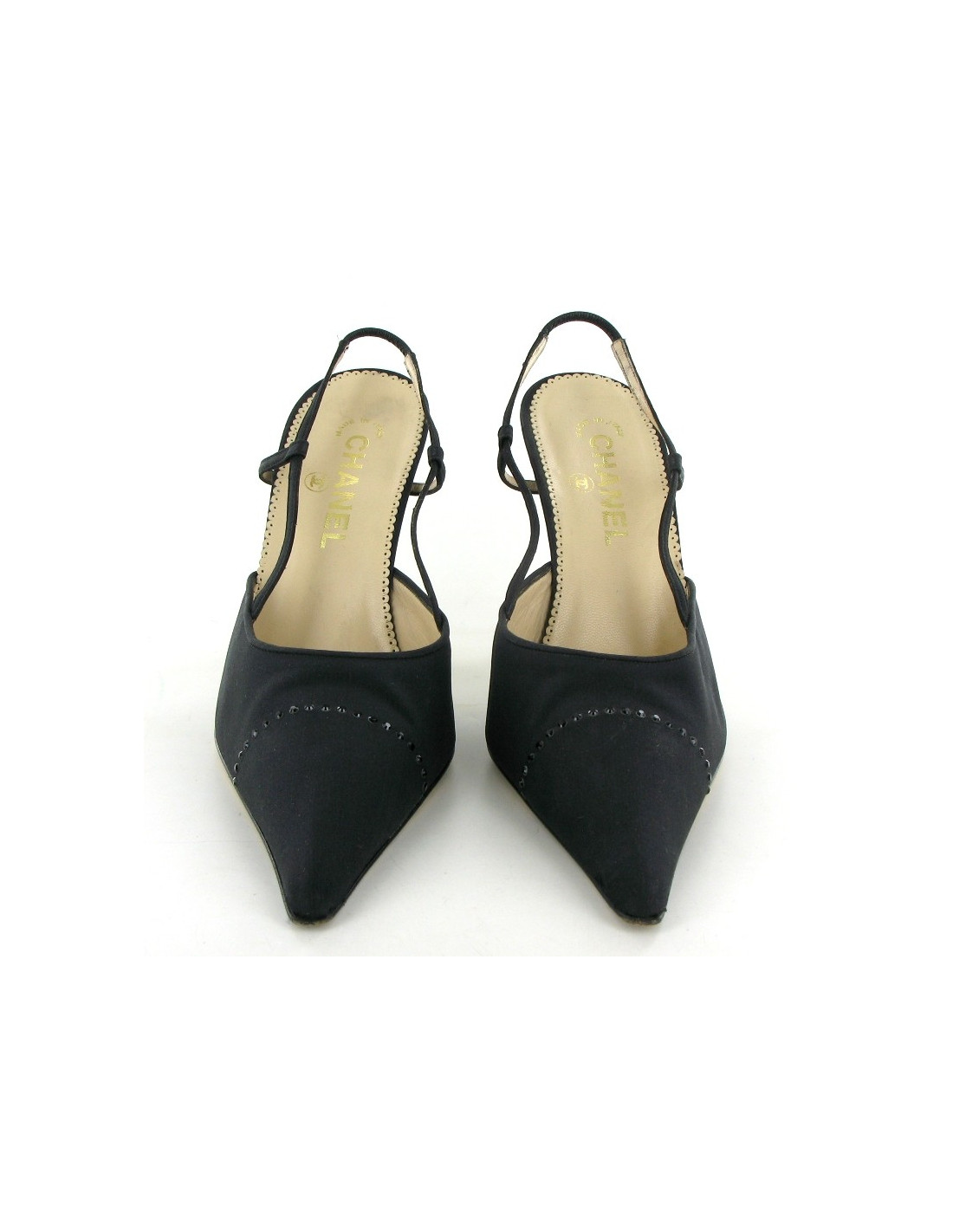 CHANEL pumps in black fabric, black rhinestones-size 37.5. The gum at the curved heel, brings a touch of originality to this very classic and elegant shoe. The fabric is beautifully decorated with a row of black rhinestone. Pretty sublime clamps the sides and ankle. Little worn this pair in very good overall condition. Inner and outer leather soles. Made in Italy.