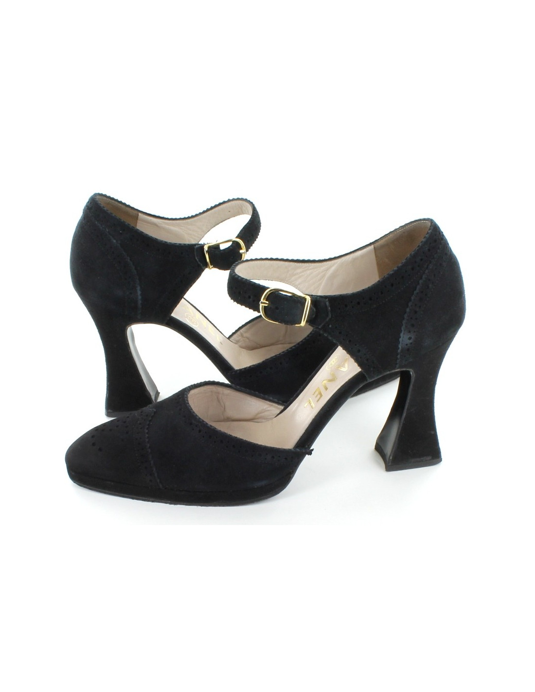 Shoes Chanel calfskin tips black velvet flowers, style church's, size 36.5. In very good condition, this pair very trendy and very comfortable. Heel sculptural form. Golden buckle. Made in Italy. Sold with their dustbag and original. Finish hand.