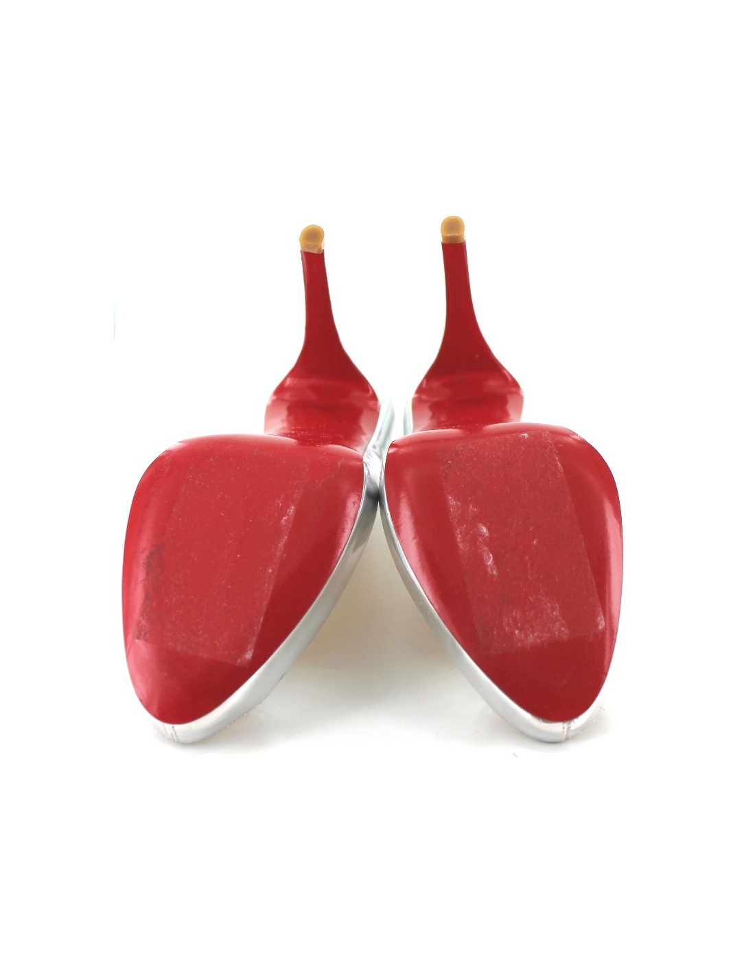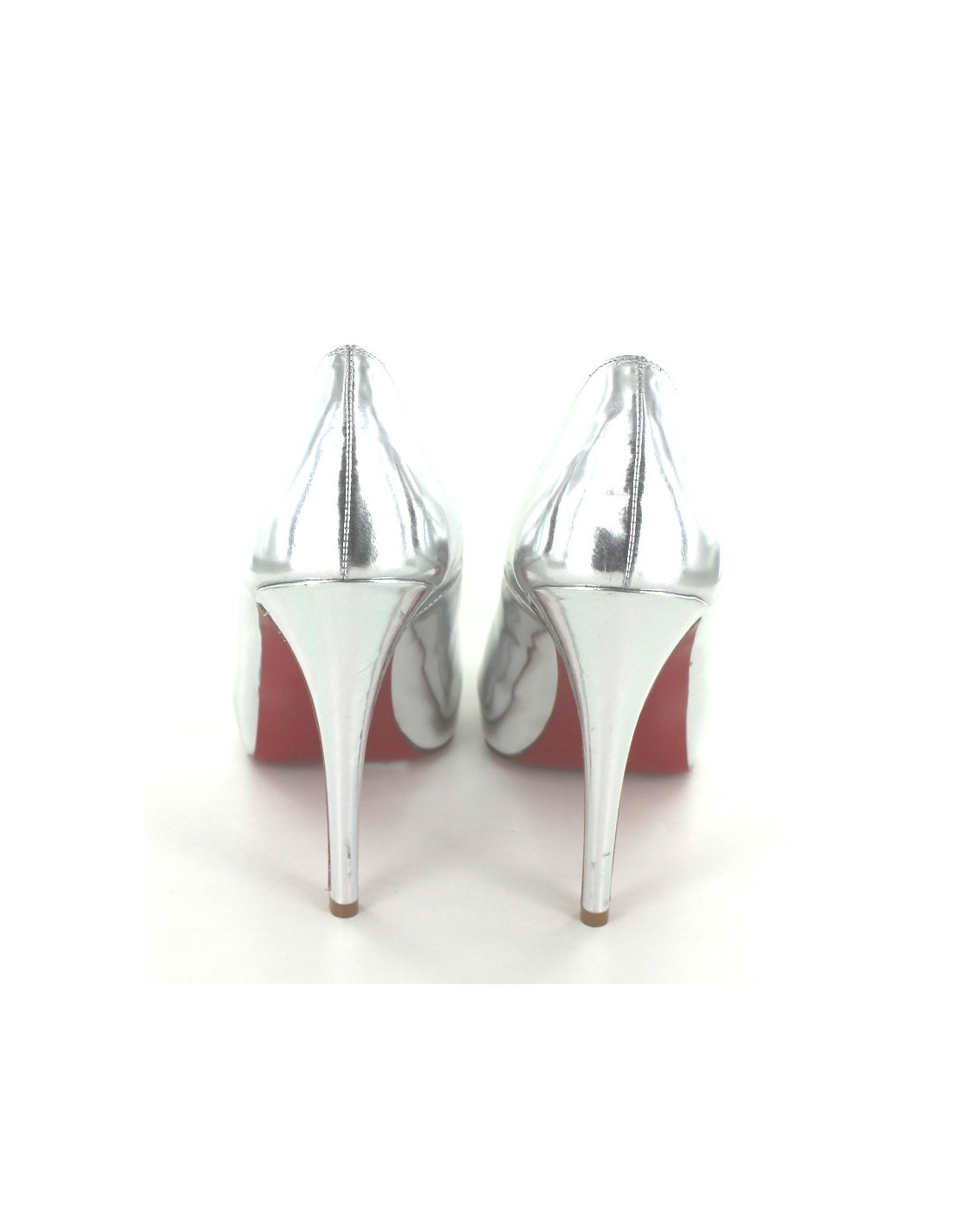 CHRISTIAN LOUBOUTIN shoes silver leather, open end. These pumps, very comfortable and stable (thick heel and platform), will give a touch of sparkle to your outfits. Nice cleavage square-rounded on the front of the foot. Exterior and Interior leather soles. On the bottoms, sale labels have stripped (very slight traces of glue). These shoes are new. Sold with their dustbag. Made in Italy.