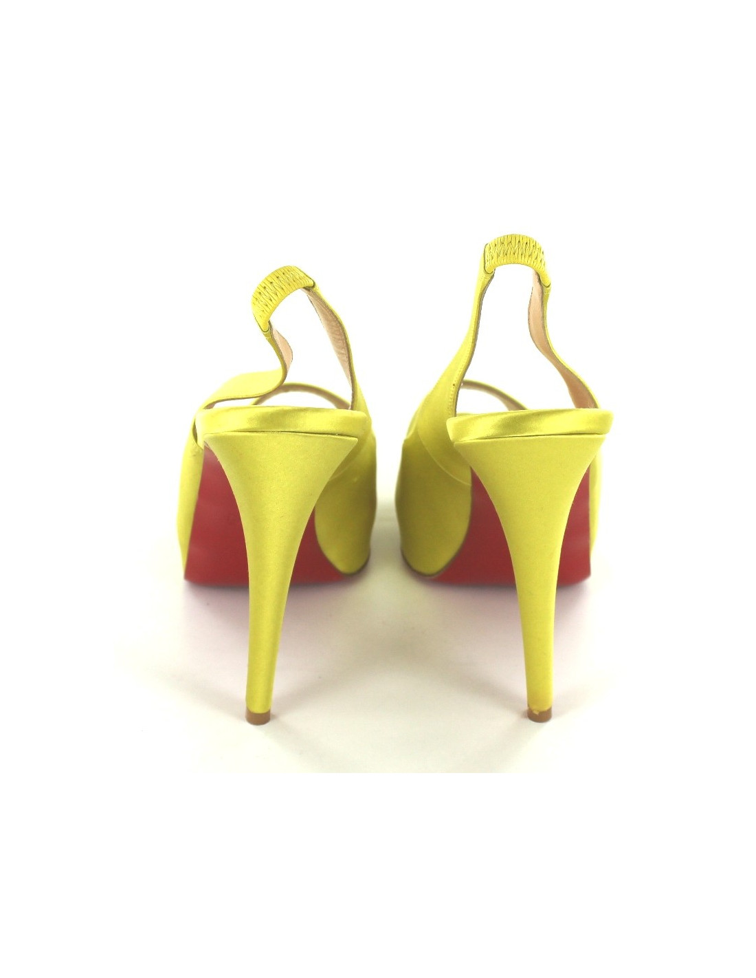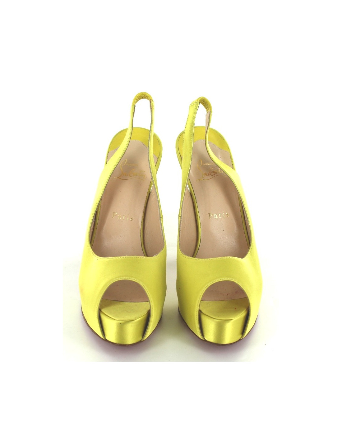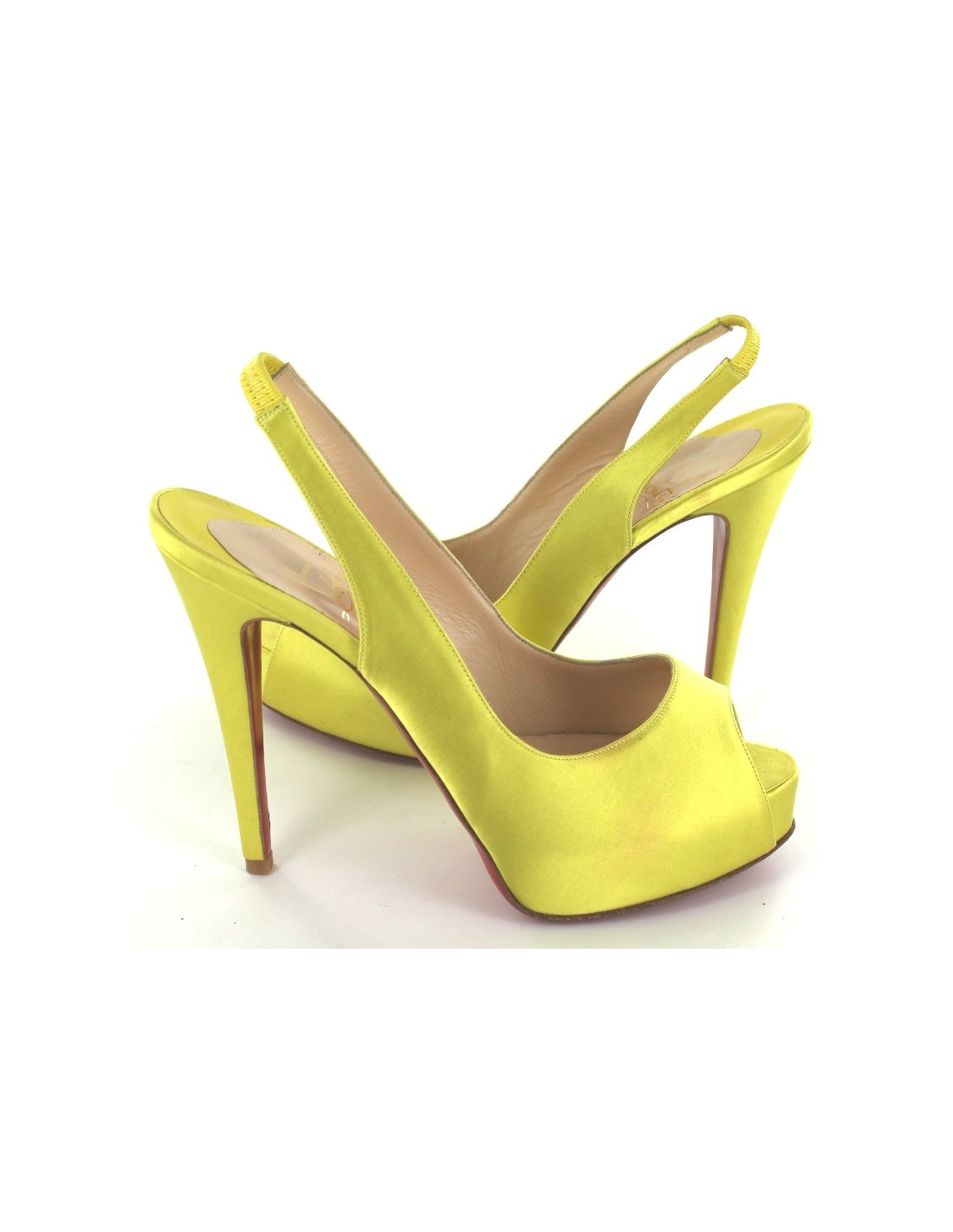 CHRISTIAN LOUBOUTIN shoes in acidulous yellow satin. Inner and outer leather soles. Satin-covered heel. Never worn, despite a few small red marks on the satin due to friction with the Red dustbag. Sold with their dustbag. Made in Italy.