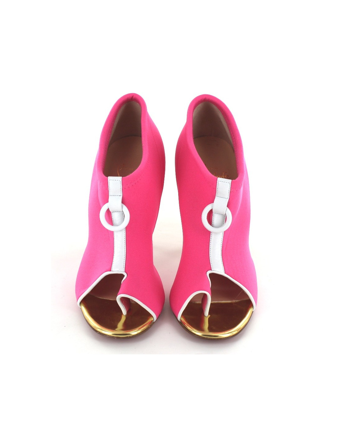 CHRISTIAN LOUBOUTIN shoes fabric neoprene pink barbie and bordered White leather. Elastic fabric. Gold heel and insole. Inner and outer leather soles. Heel very end open end and notched for thumb on the foot. These shoes are new. Sold in their dustbag. Made in Italy. - Size: 39- Semellle length: 25 cm, width: 8 cmHeight