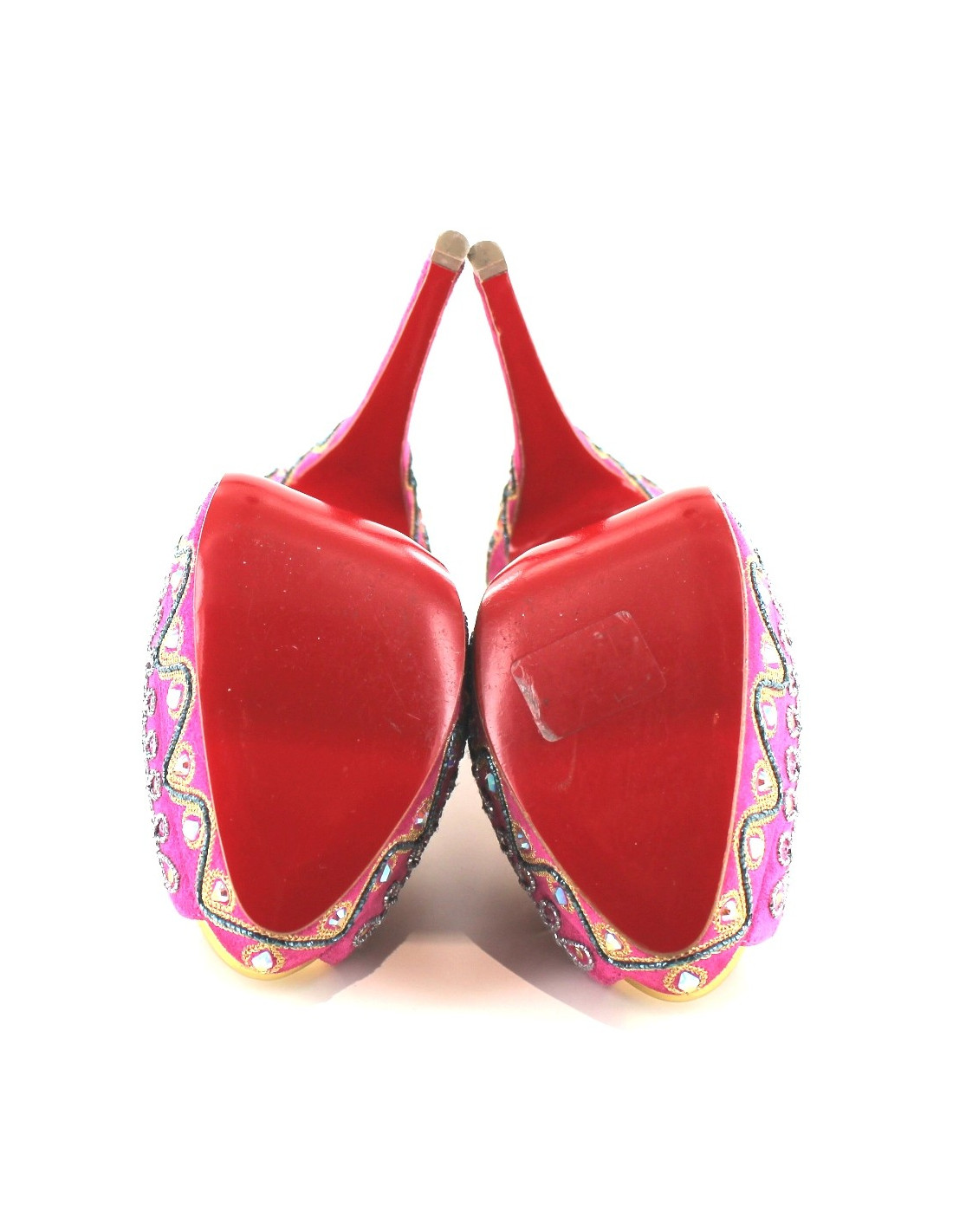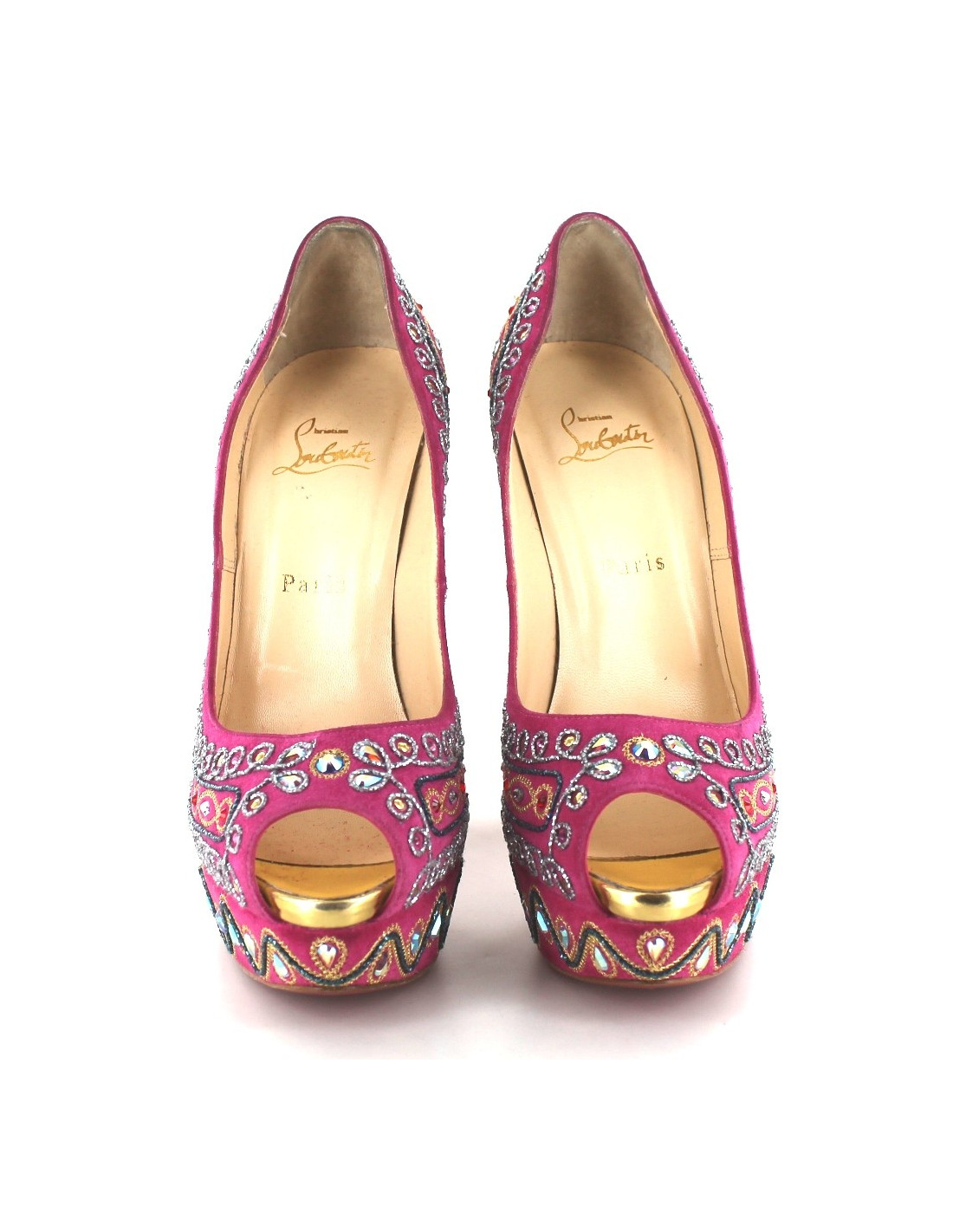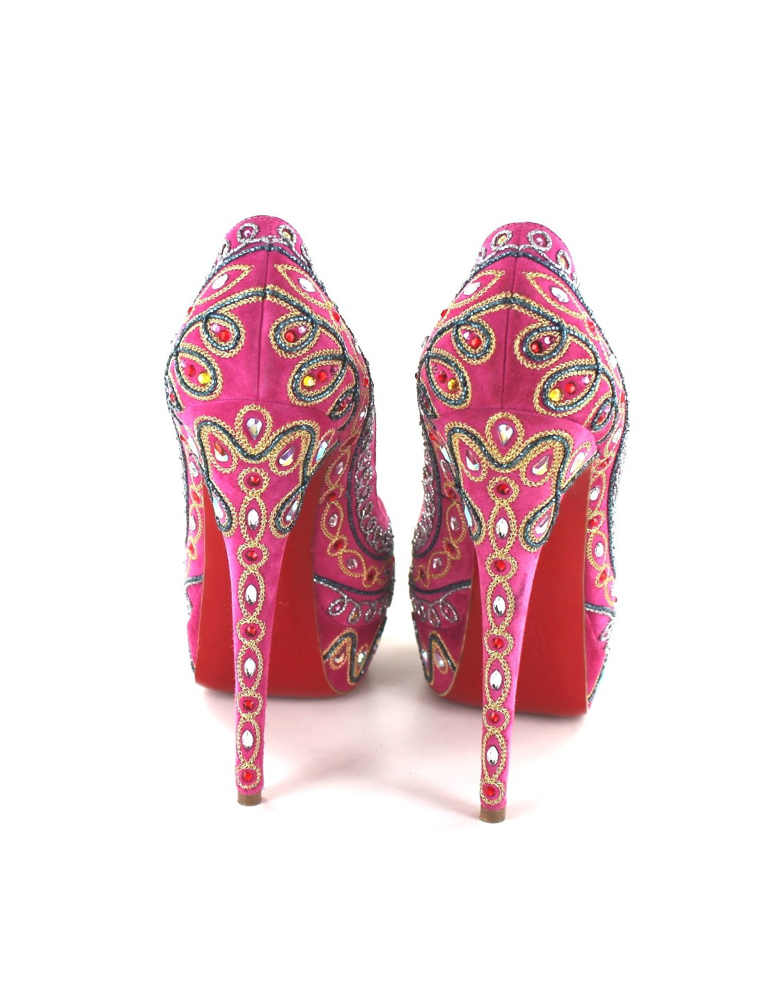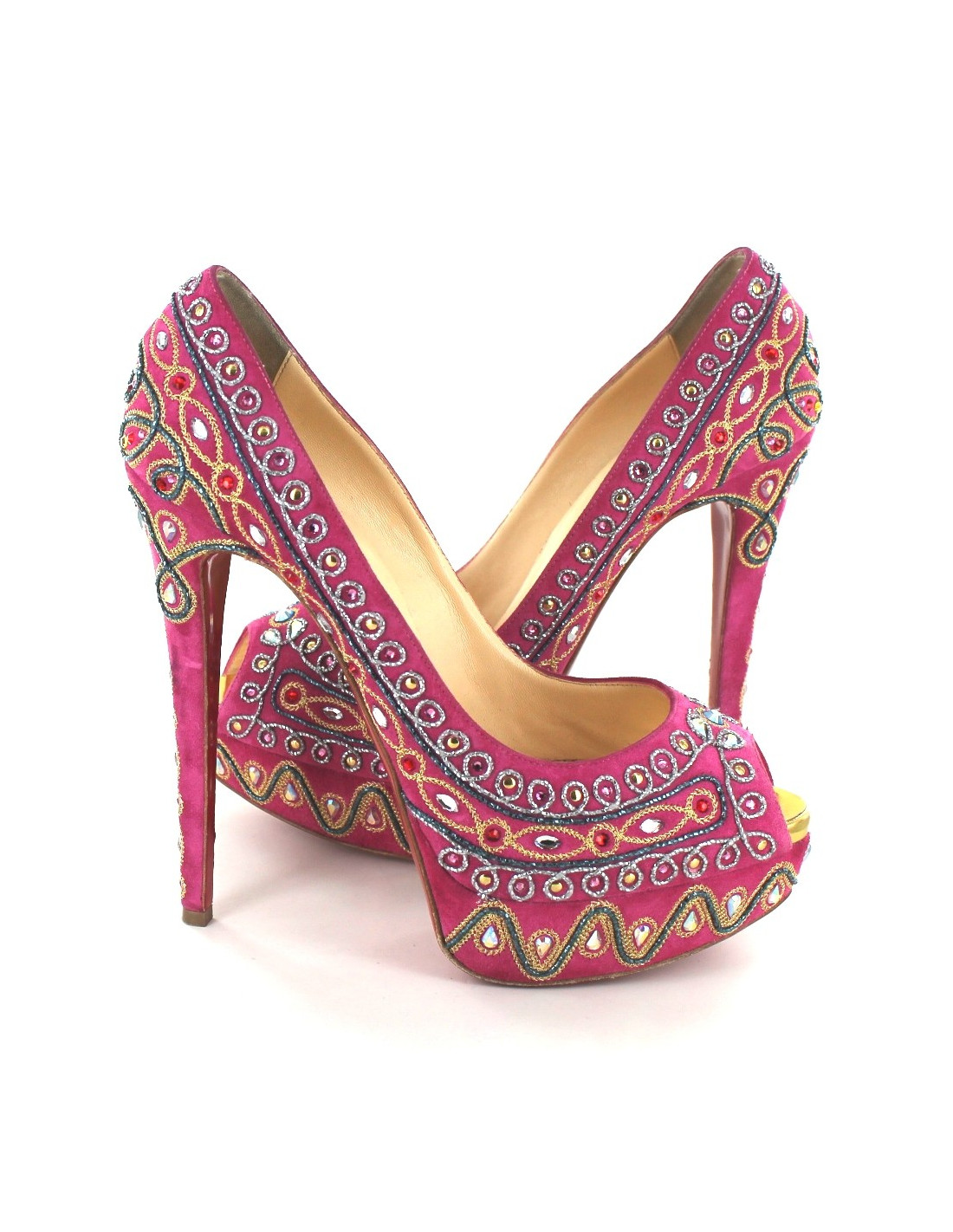 Pumps "Bollywood" T40, 5 CHRISTIAN LOUBOUTIN in pink Suede, exclusive embroidery collection. EXCEPTIONAL model. Embroidery in pearls and rhinestones are grey, Golden, blue, red and pink. The front of the foot is open. The sole on the front in gold. Inner and outer leather soles. These shoes have been brought to a recovery. Made in Italy