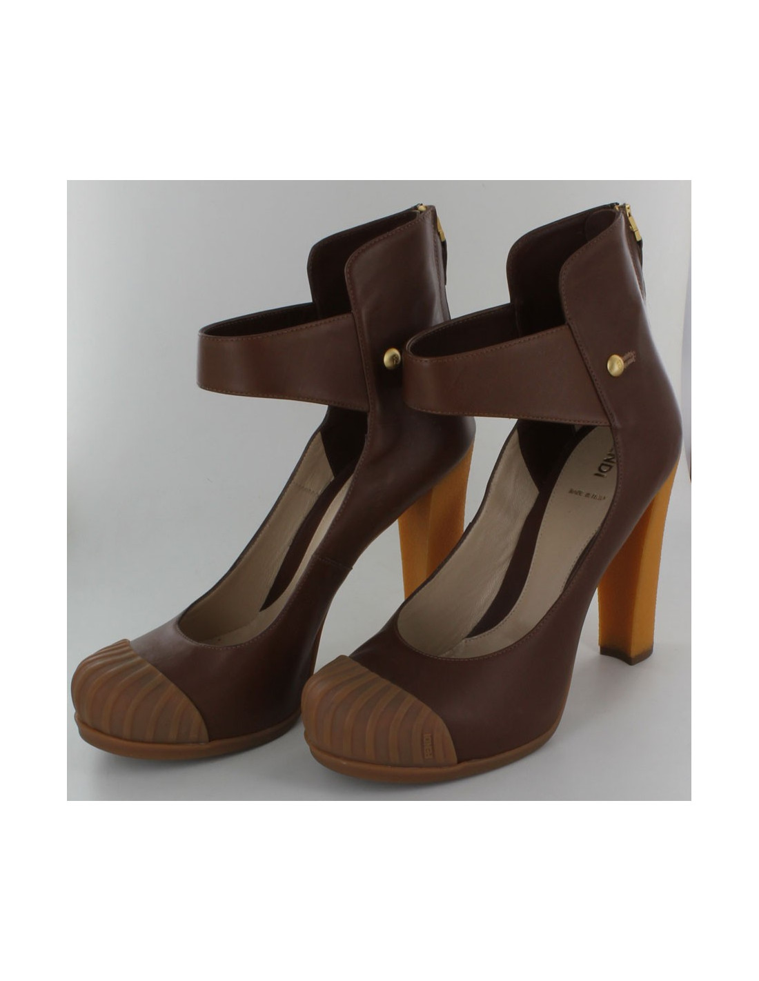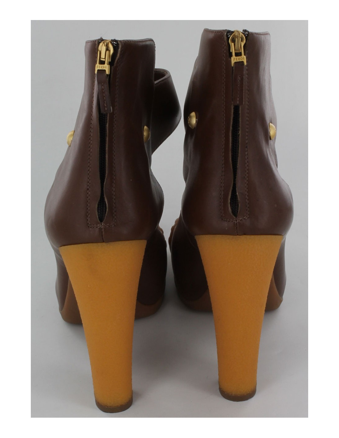 Open ankle FENDI brown leather. Size 41. Rubber sole with tip reported rubber, slightly embossed. Buckle leather at the level of the ankle. Two buttons gold with the initials "FF" from each side of the ankle. Closure with a zip at the back of the ankle.