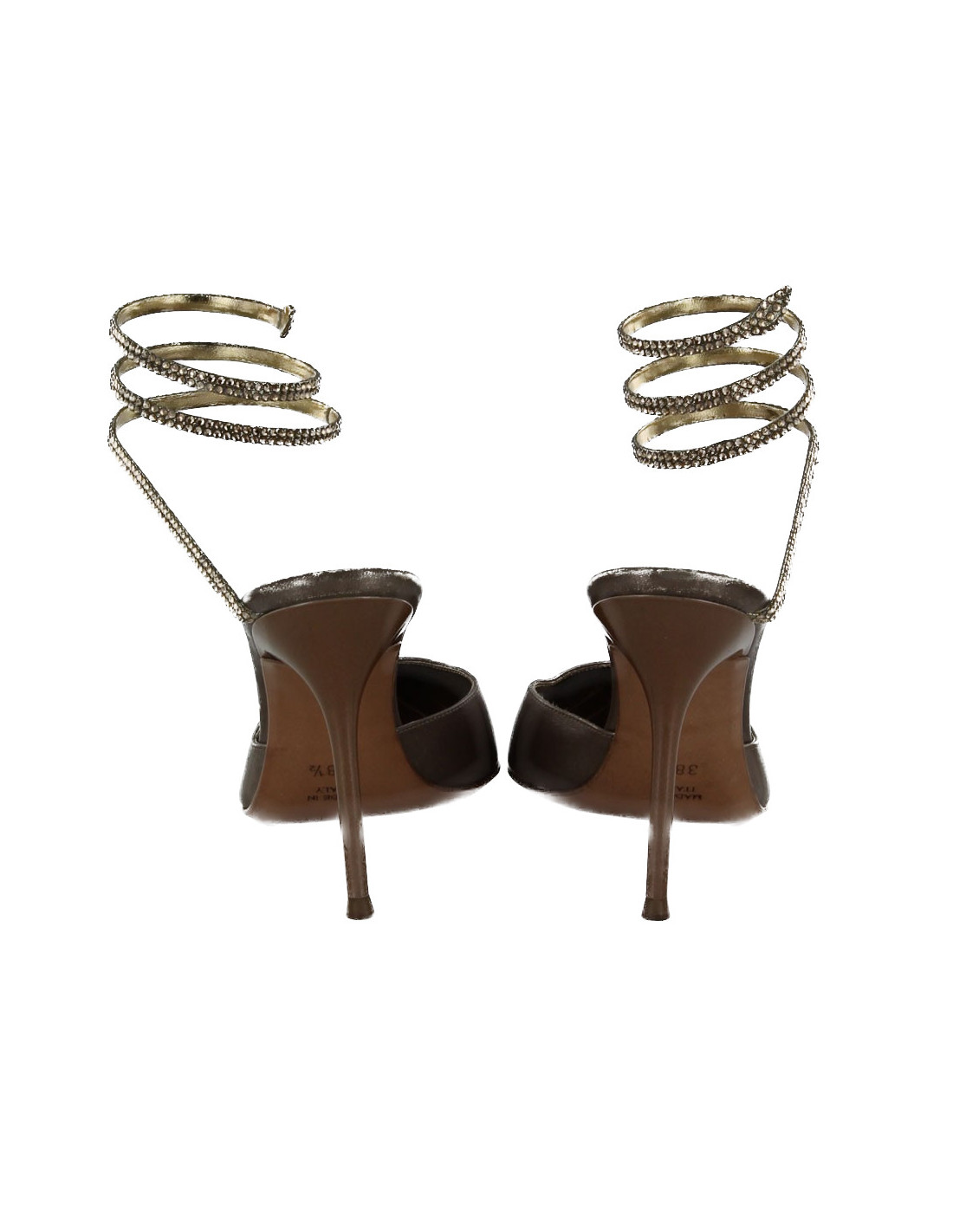 Exceptionnelle paire d'escarpins René Caovilla T38,5, en cuir lisse couleur bronze doré. La peg is surrounded by a snake in swarovski crystal. Public price: 1000 euros.