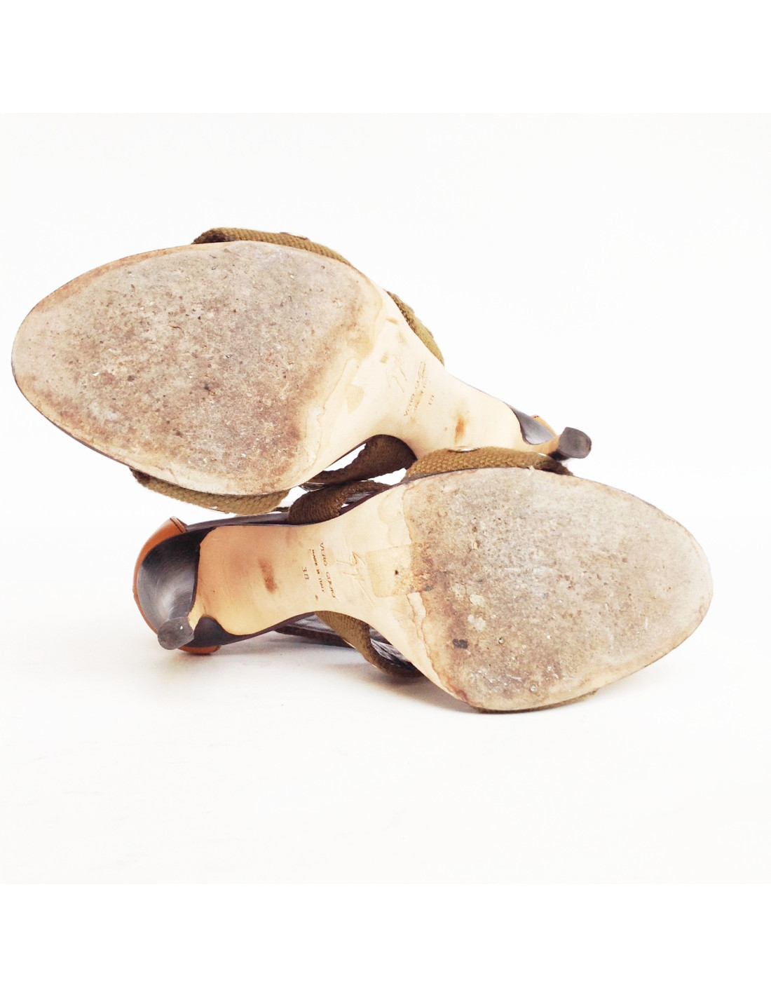 Sandals GIUSEPPE ZANOTTI T 38 two-tone khaki green canvas and brown leather heel.