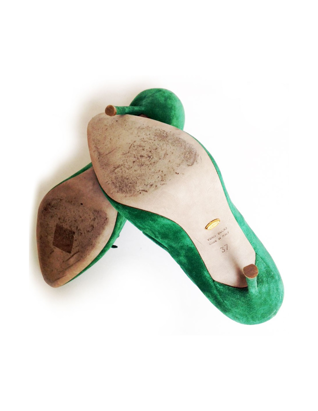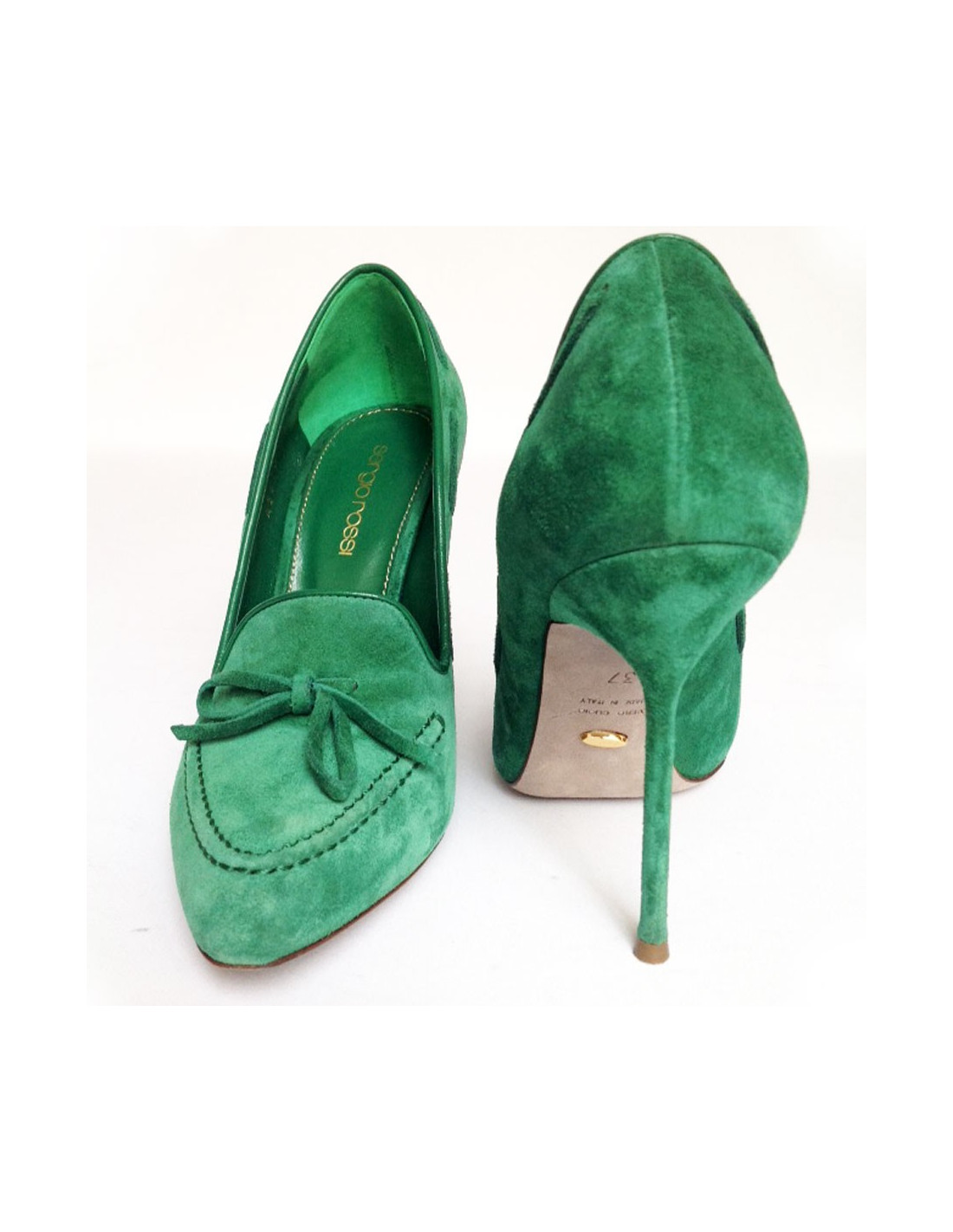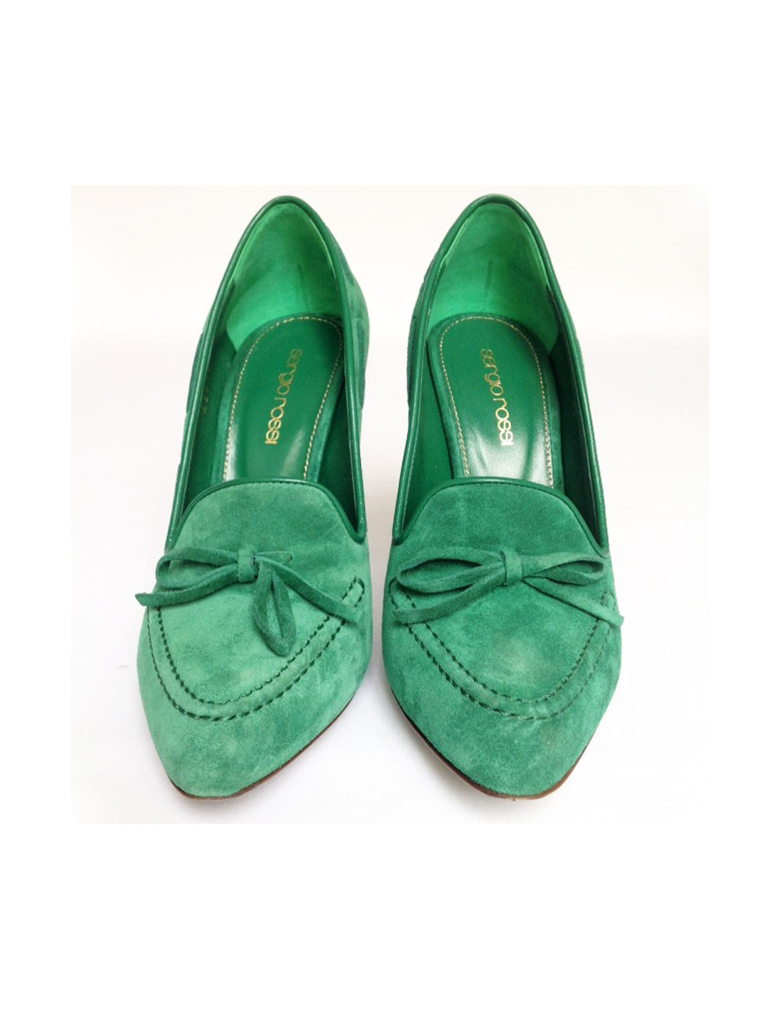 Sergio Rossi size 37 green suede pumps. Topstitching operations are green as well as a node at the front of the shoe.