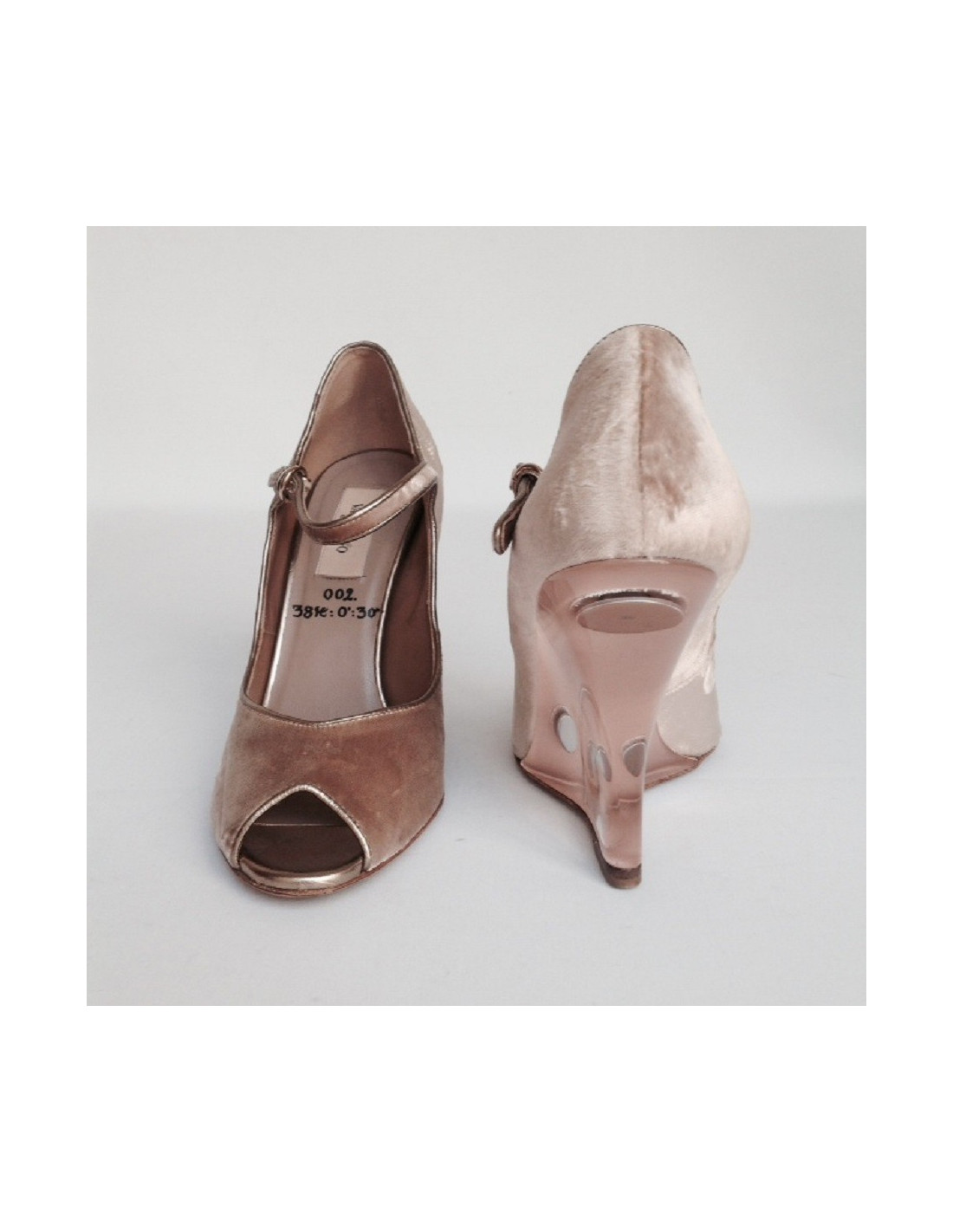 In very good condition. Just a tiny bit of wear of panne velvet inside the left shoe.