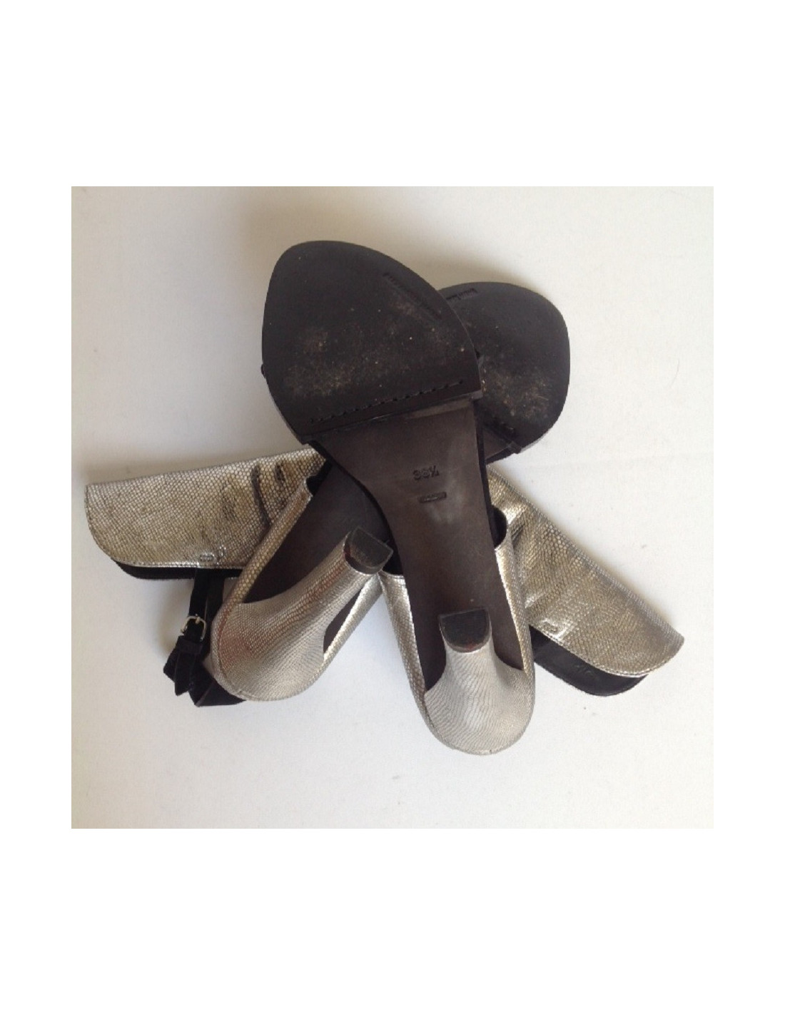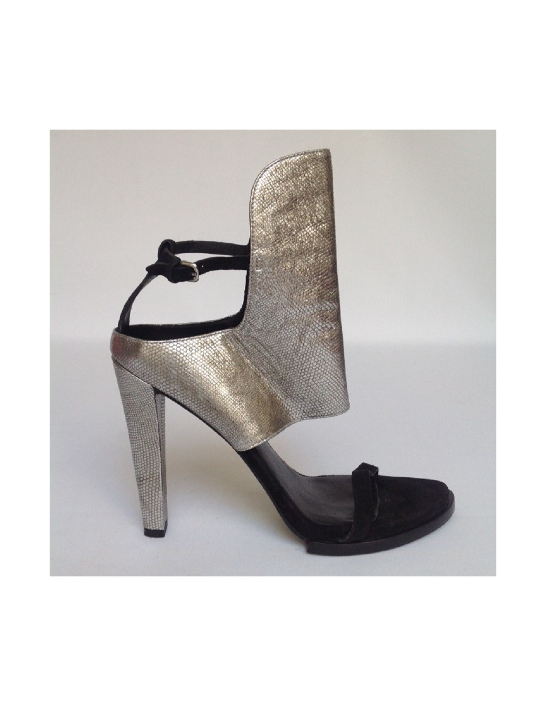 The strap is black suede and any part that holds the ankle is leather silver as well as the heel.