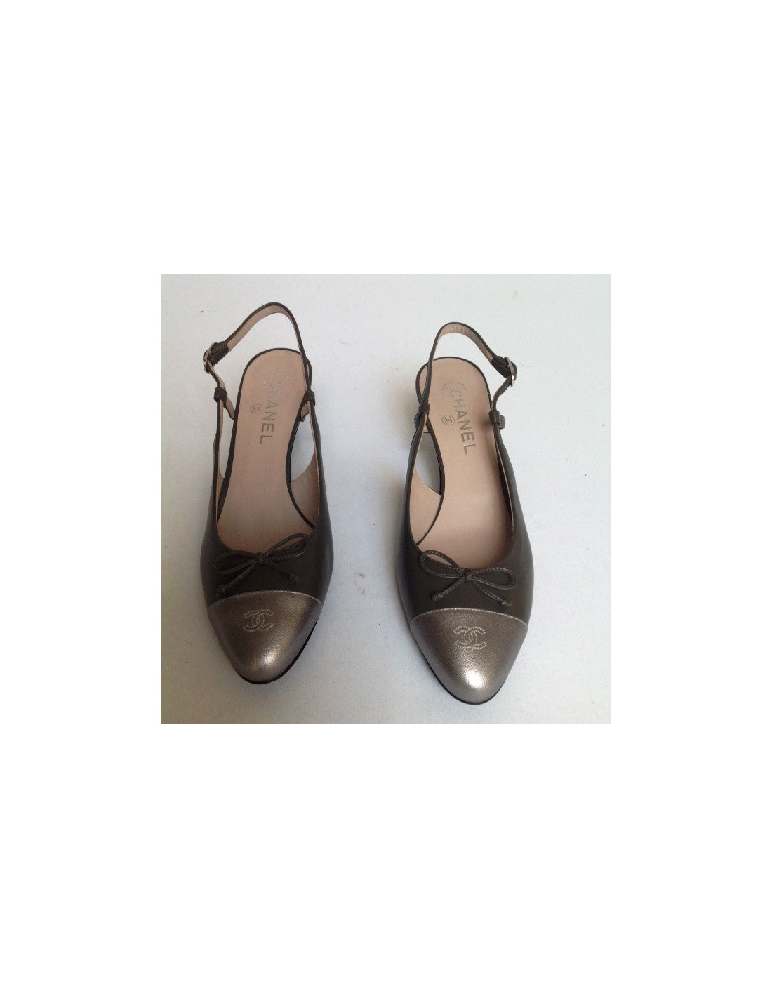 The front of the shoe is leather logo silver CC logo embroidered in white