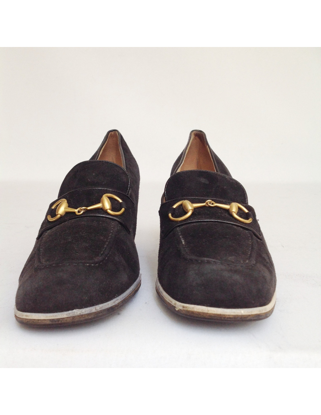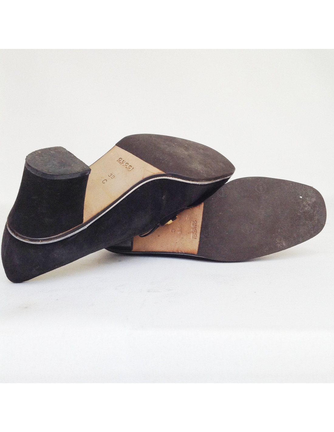 GUCCI loafer in suede black T39, with heels. They are in very good condition (some traces of wear and tear of use) . On the front of each shoe, a metal clamp gold, emblematic of the Gucci brand.