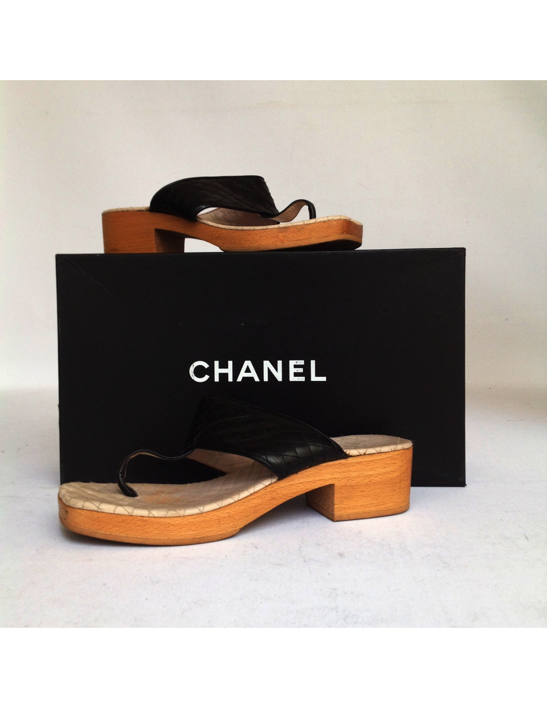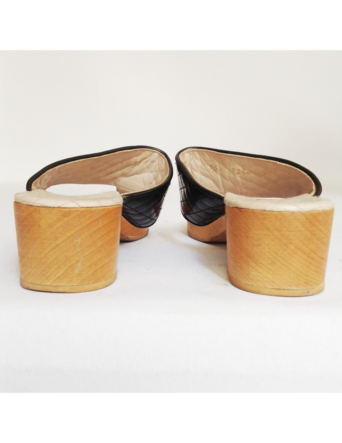 Hooves T38 Chanel quilted Black patent leather and soles in light brown wood. Manufactured in France. In good condition. The sole is slightly faded.