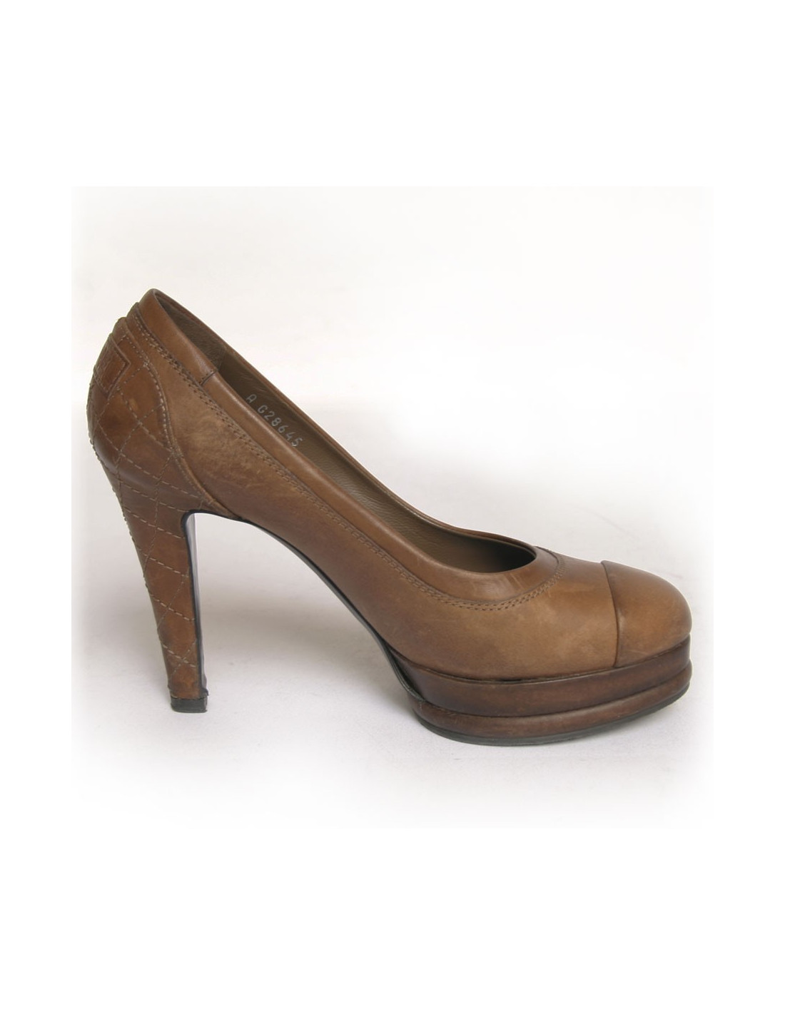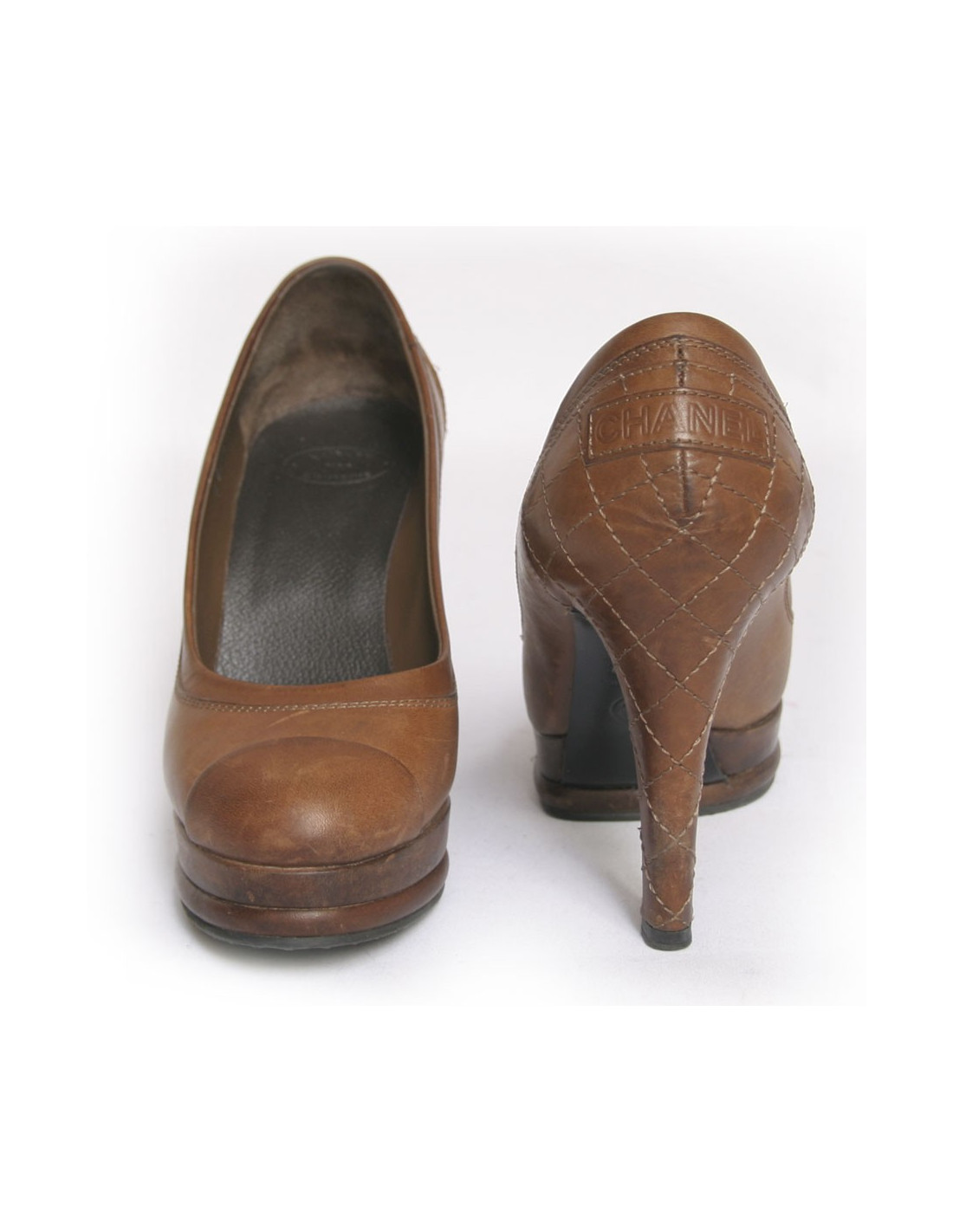Pair of shoes Chanel Tan Leather. Size 36.5. Topstitching, effect quilted on the heel of the shoe. "Chanel" inscription on the back. In good condition. Light marks of wear on the front as well as on the heel. The sole under the heel is slightly off. see photos.