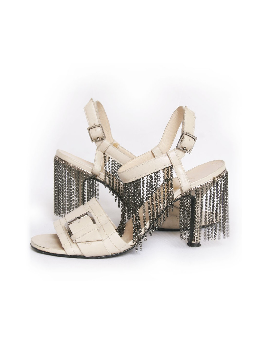 High Sandals Chanel beige leather. Size 39. Ruthenium strings come fall on the ankle as well as on the heel. "A strap on the front of the shoe with the inscription ' CHANEL ' on the loop. In very good condition.
