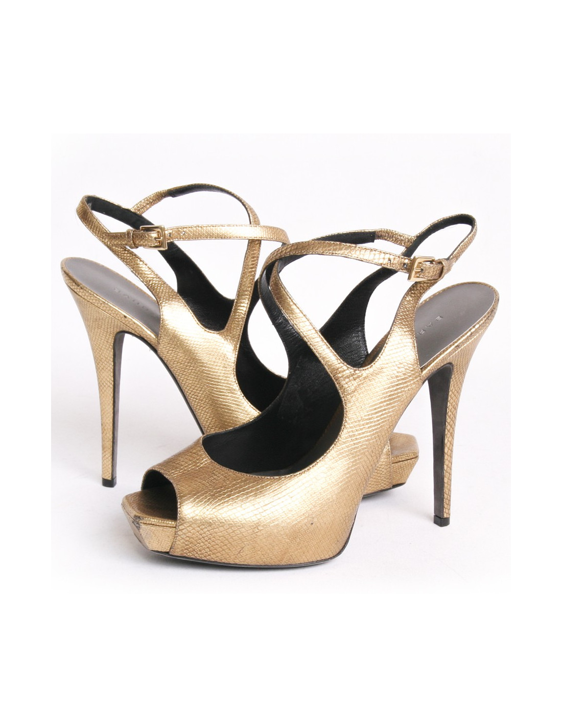 Heels Barbara Bui Golden way scale size 39. The strap is crossed on the front of the foot, it is adjustable according to the size of the foot. There is an integrated platform for comfort, as well as a non-slip pad under the shoe. In very good condition. There are some signs of wear on the shoes.