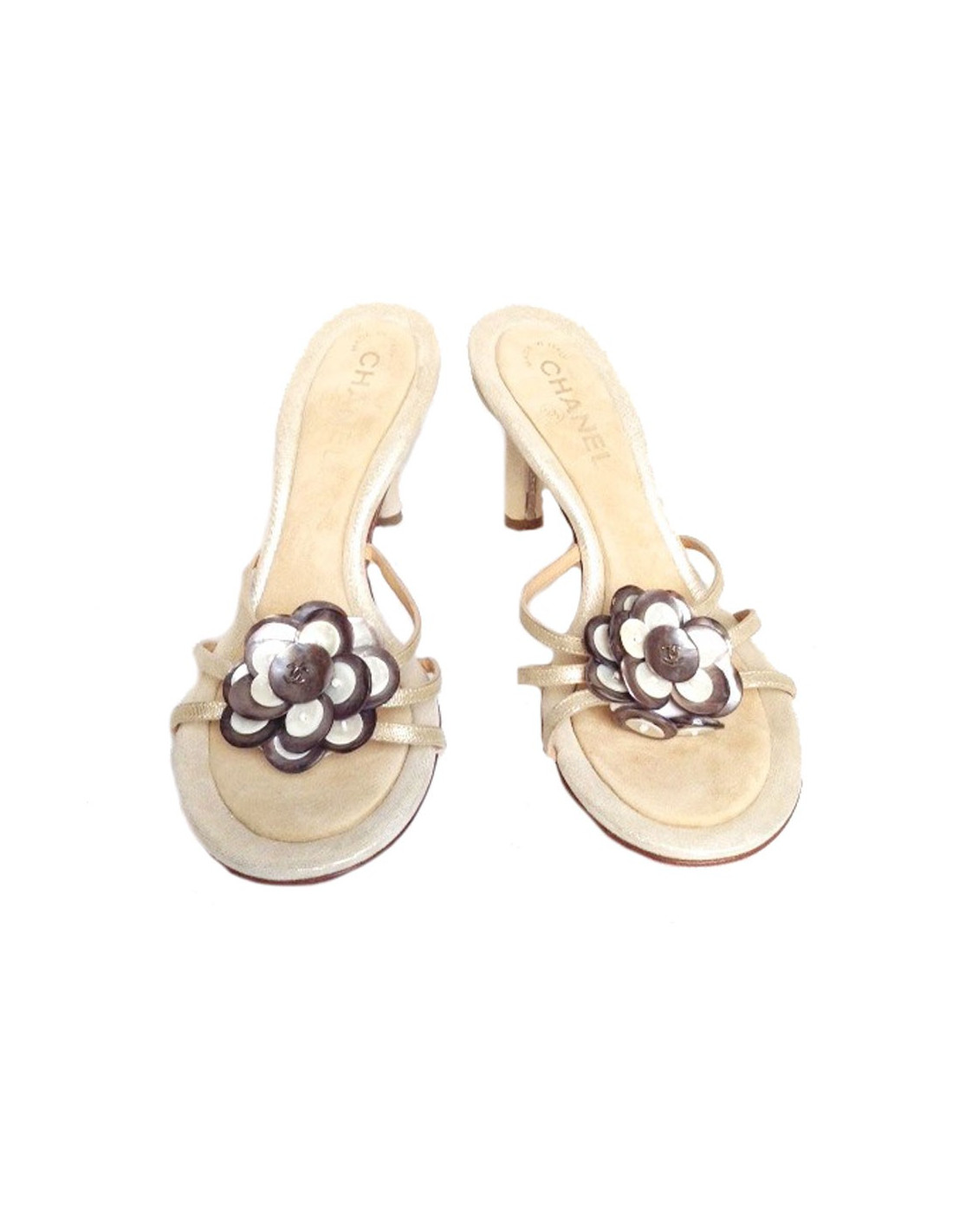 Sewing! Chanel Sandals high heel Suede, adorned with buttons in mother-of-Pearl, in very good condition, worn only once.