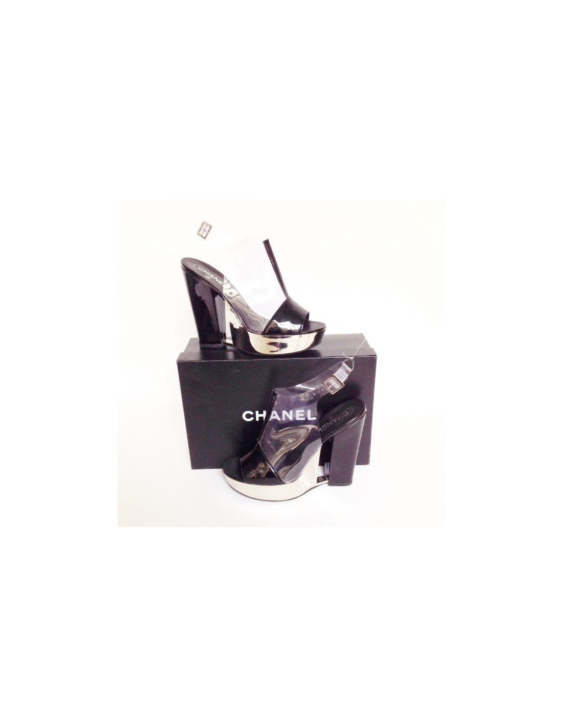 Model rare and comfortable thanks to the front of the sole fleece, a heel and a broad platform that allow a perfect balance despite the Arch of the foot and the heel height. The special feature of the shoes is illusion platform/offset of the pump through the metal plate labeled "double c" connecting the front of the shoe and heel. The shoe, although large and massive, leaves an impression of lightness and a certain refined appearance thanks to the transparent conduct of the foot and the mirror effect.